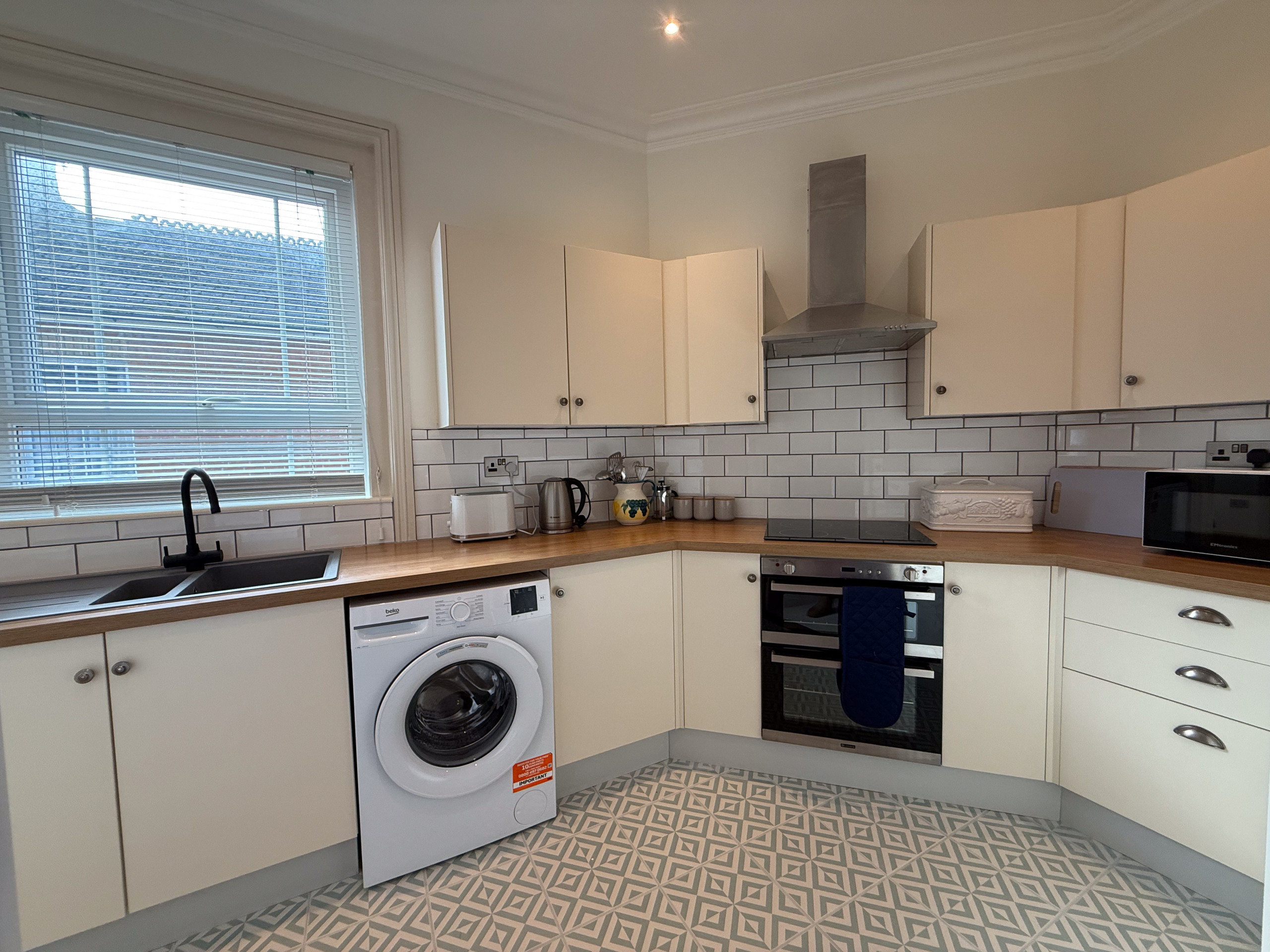 Kitchen – Electric hob and oven, fridge freezer, washing machine, dishwasher, kettle, toaster, microwave, cafetière, tea pot