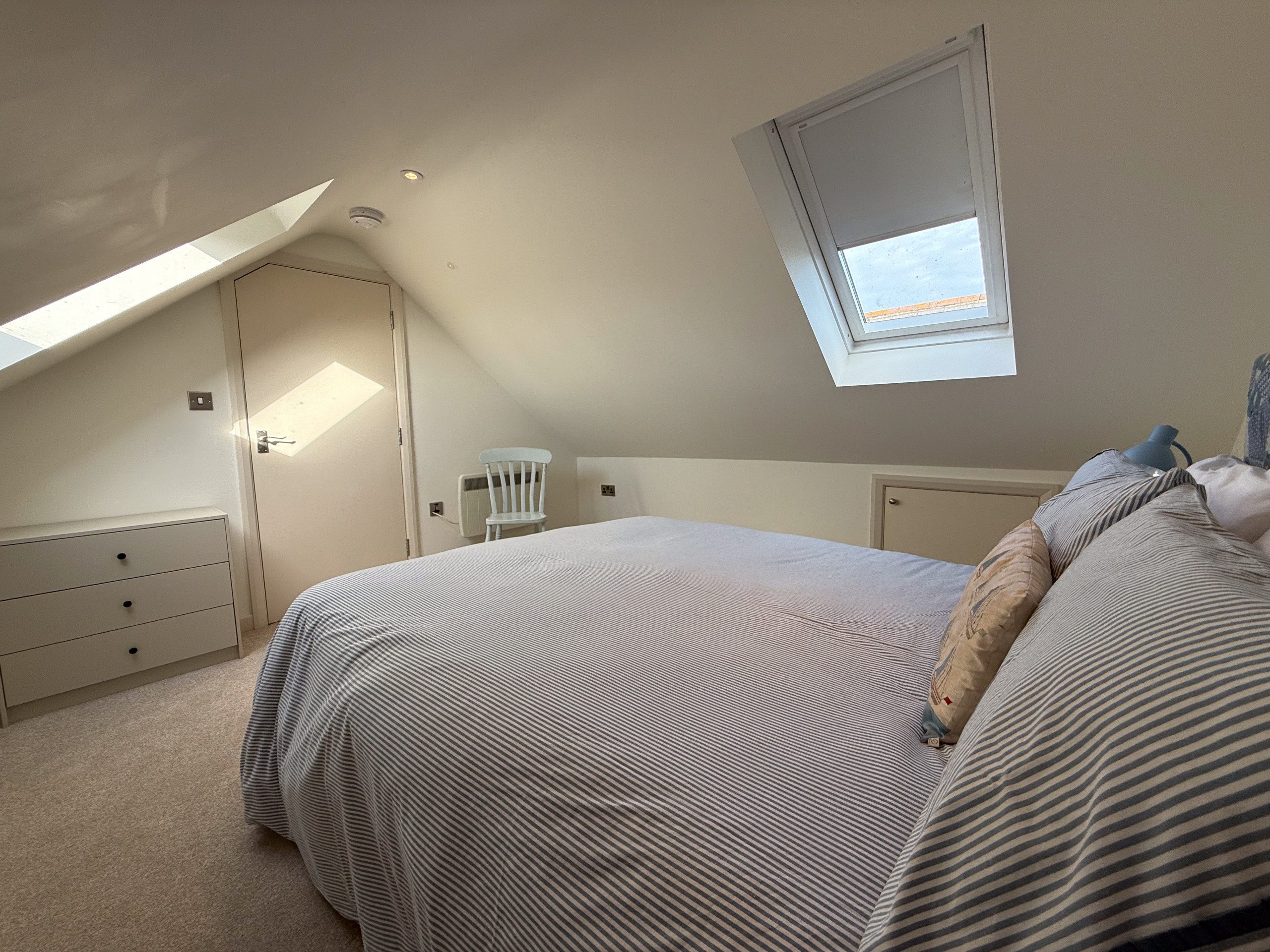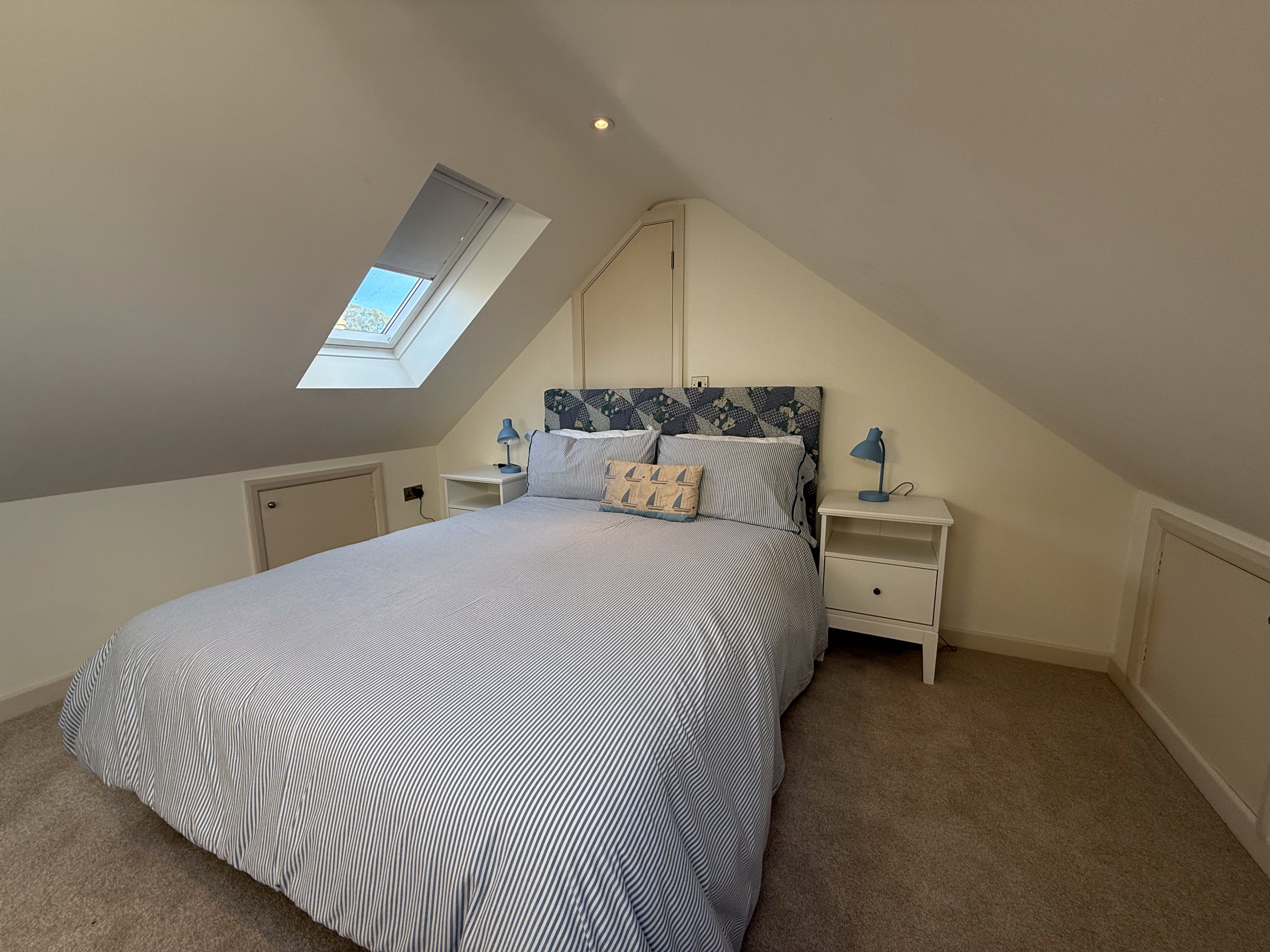 Bedroom 2 – Double bed, bedside cabinets with lamps, small chest of drawers
