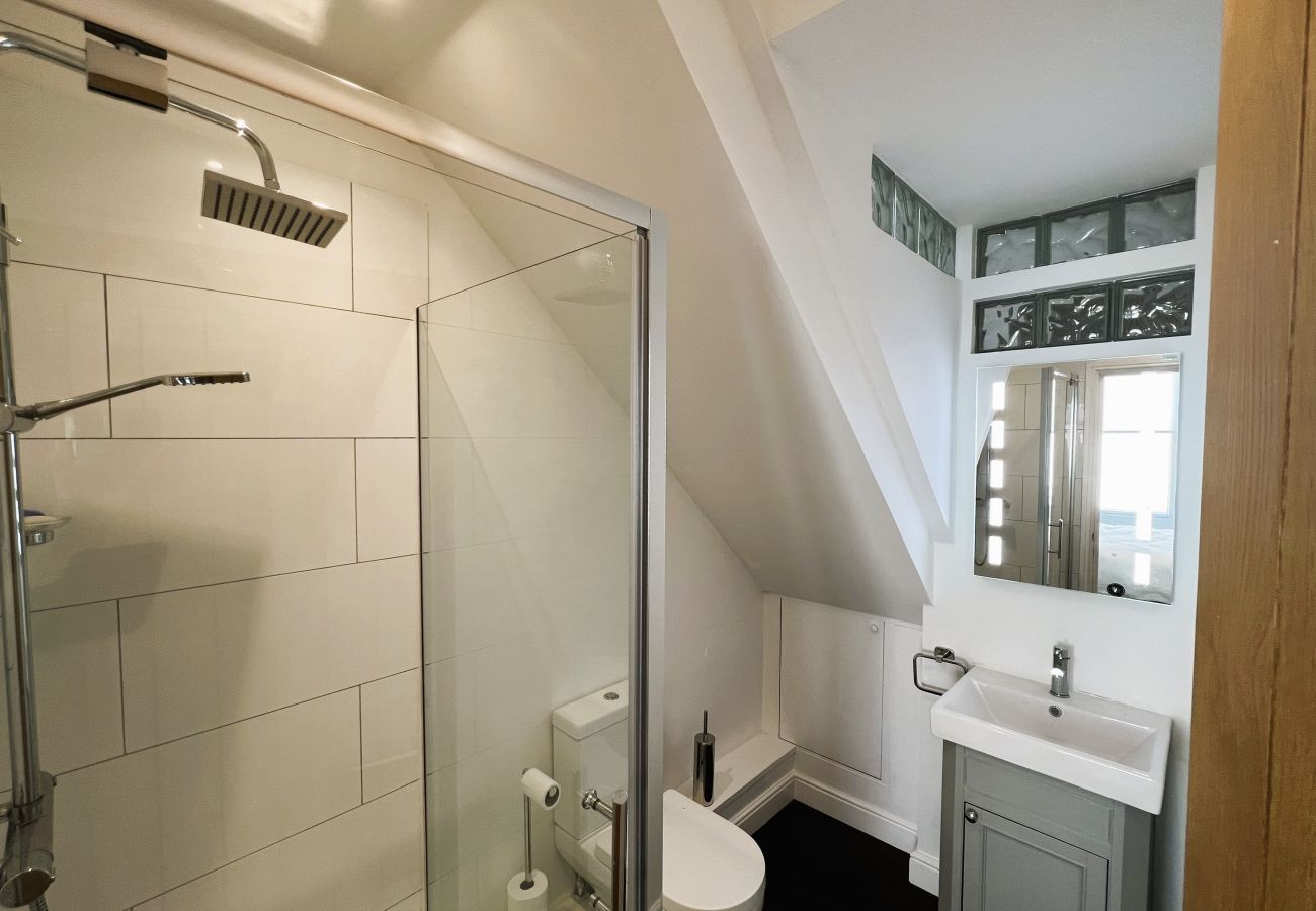 on the lower floor discover two thoughtfully appointed bedrooms. A spacious double room features an en-suite shower for added convenience, while a charming twin room awaits, complemented by a well-appointed family bathroom.