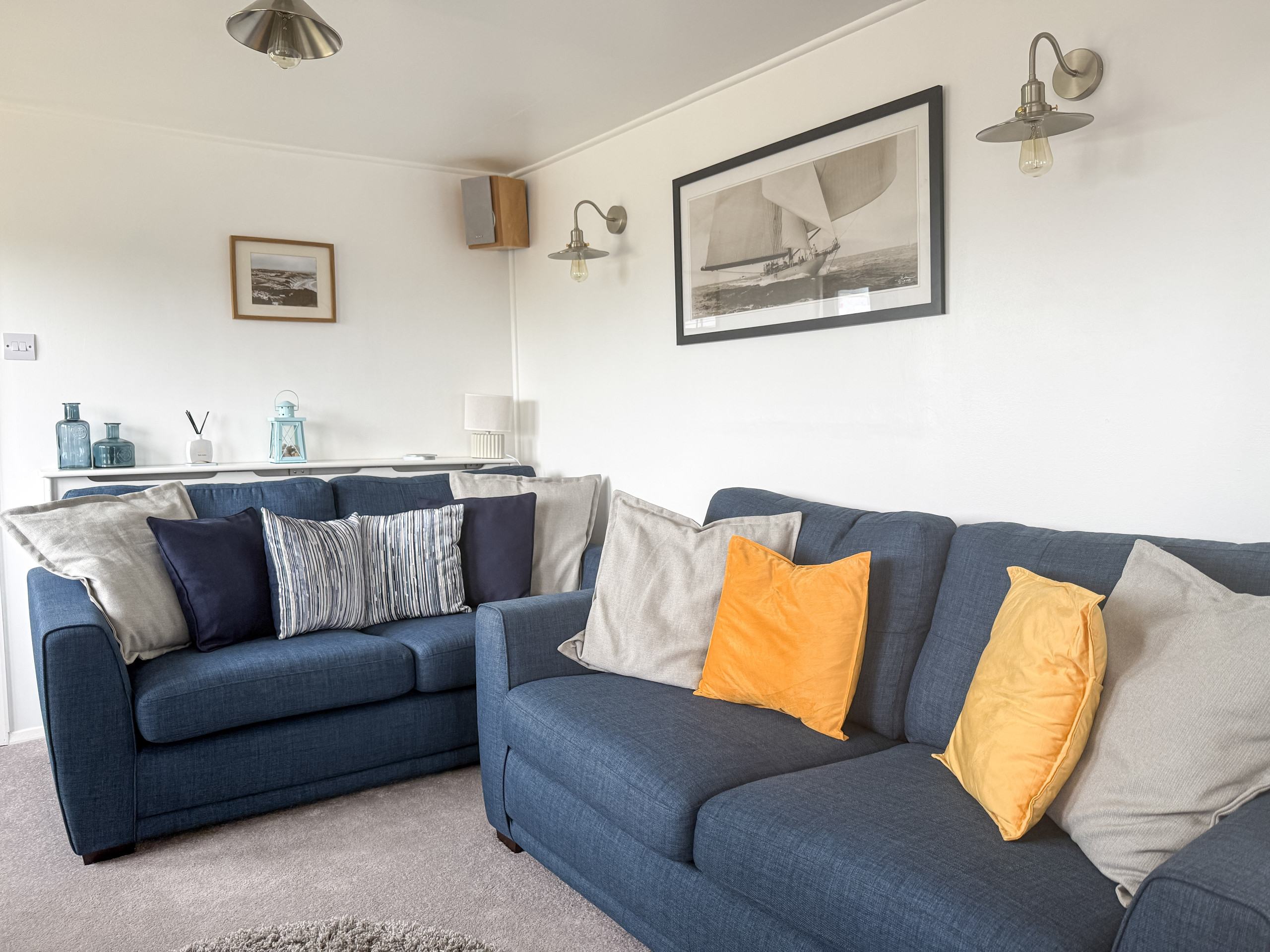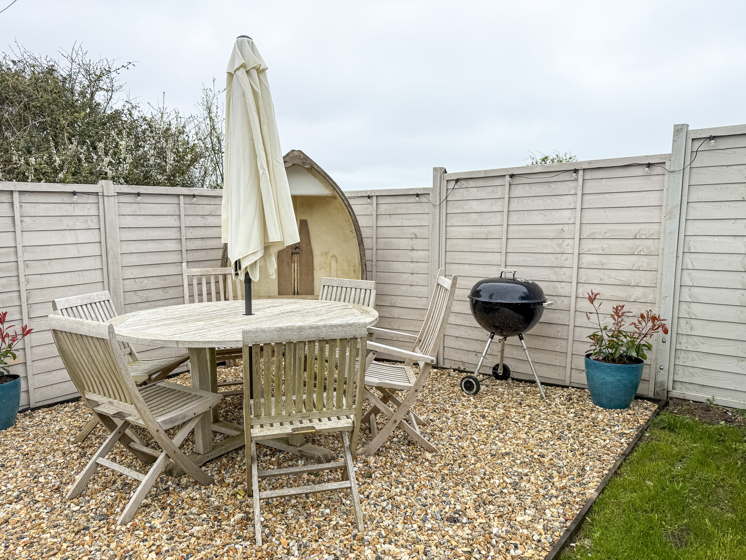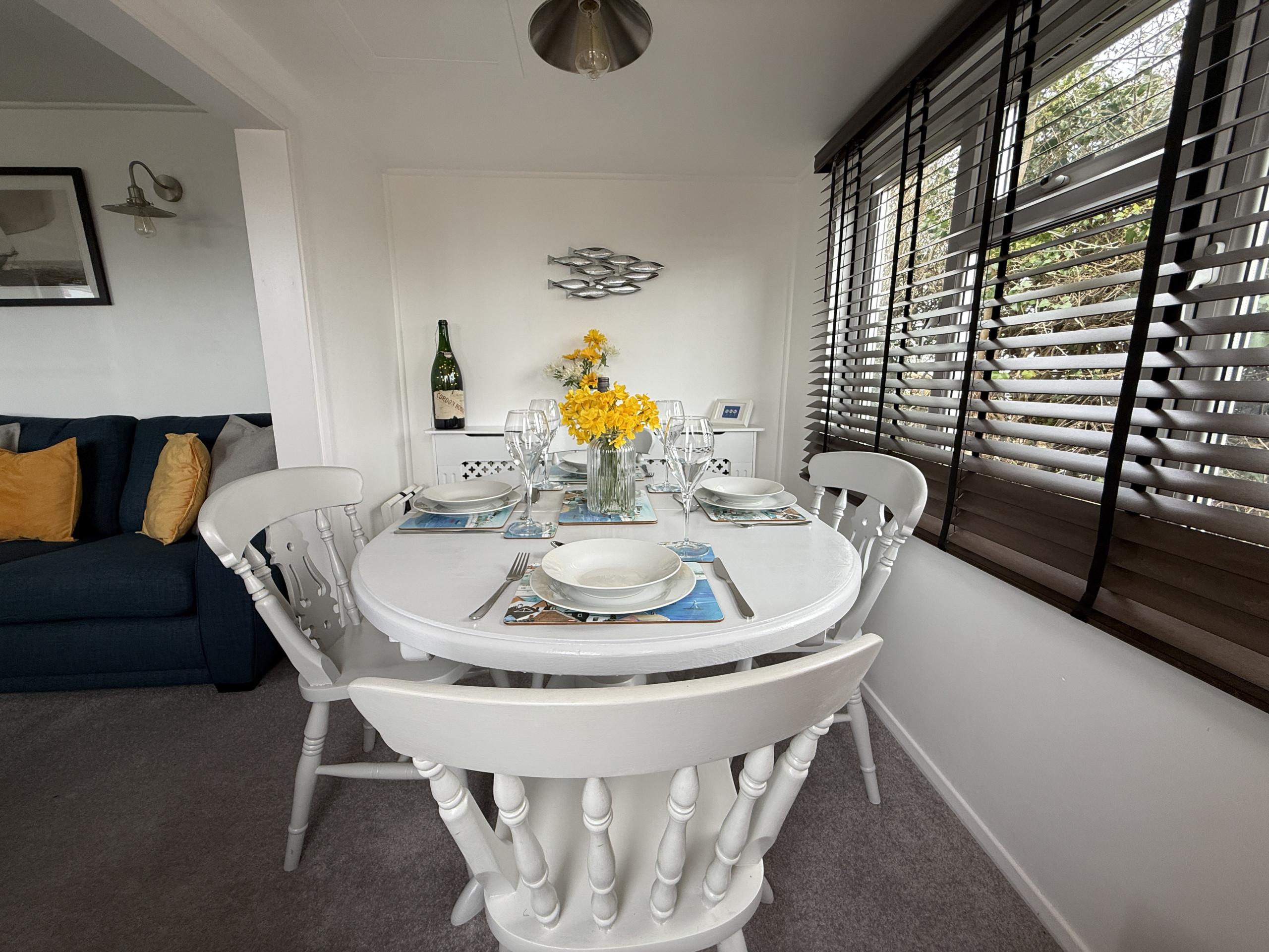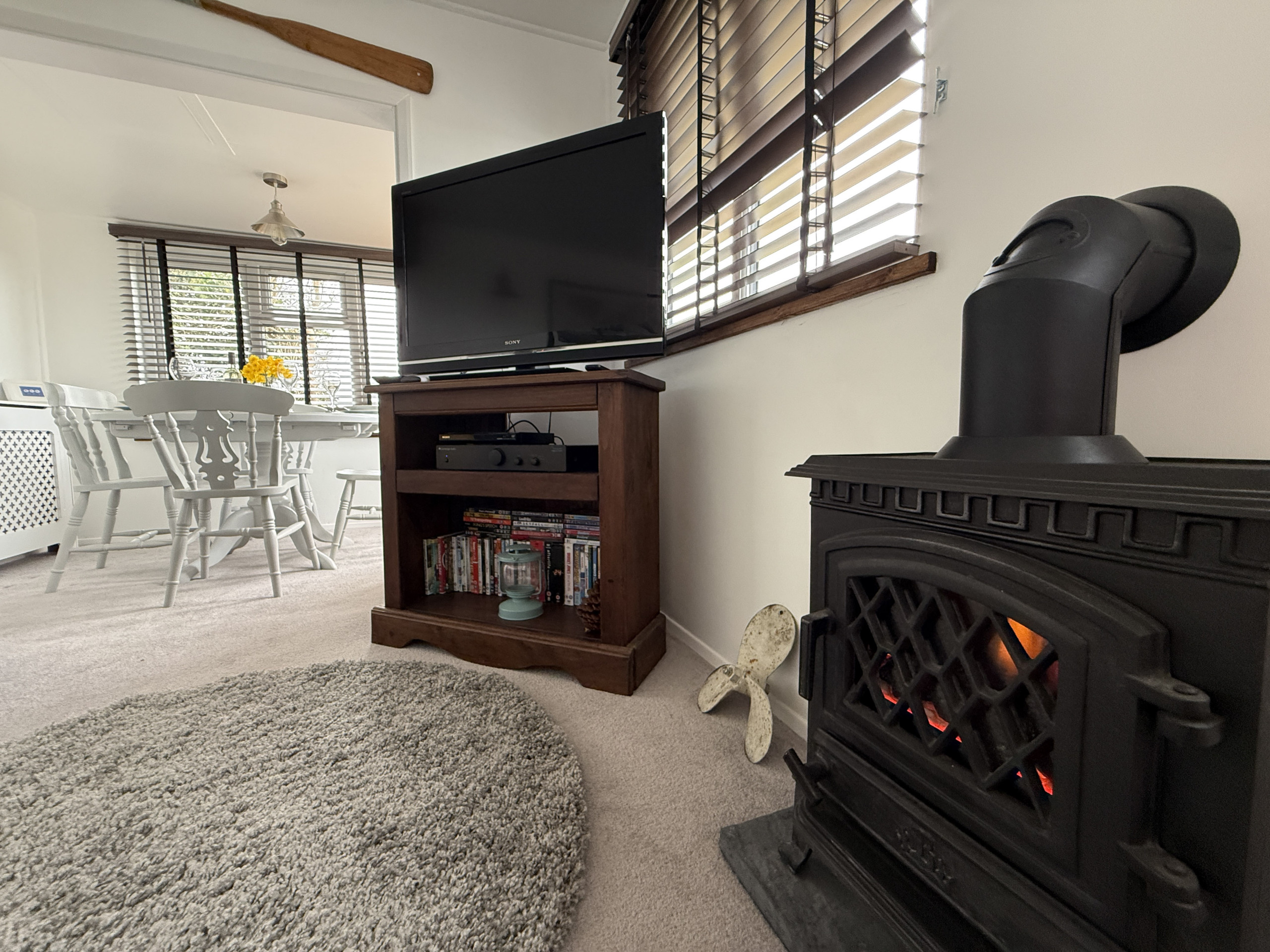 Lounge - 2 x 3 seater sofas, Smart Tv, Electric log burner, Dining room table with seating for 6, Bluetooth surround system - links to the main bathroom, games console
