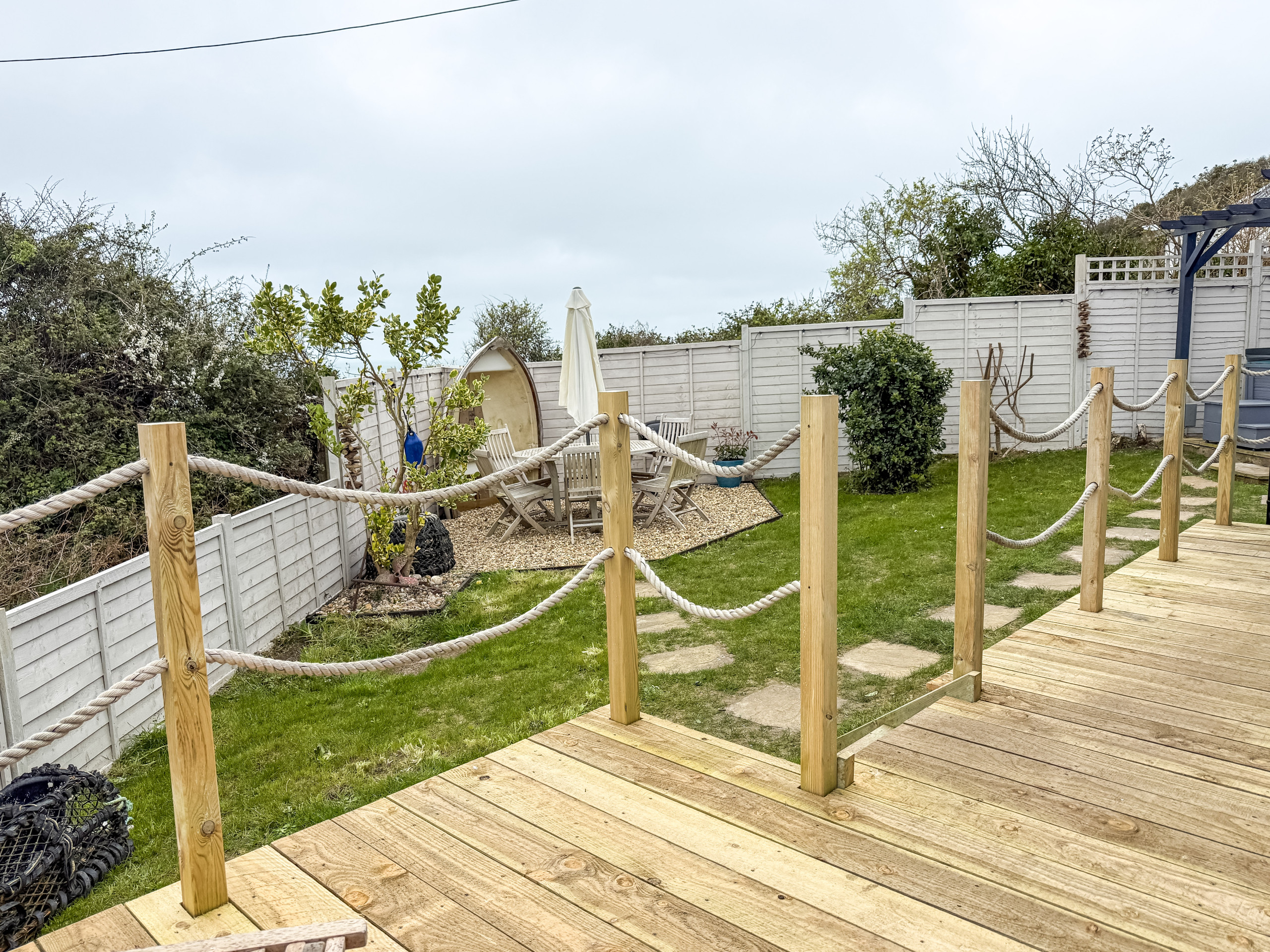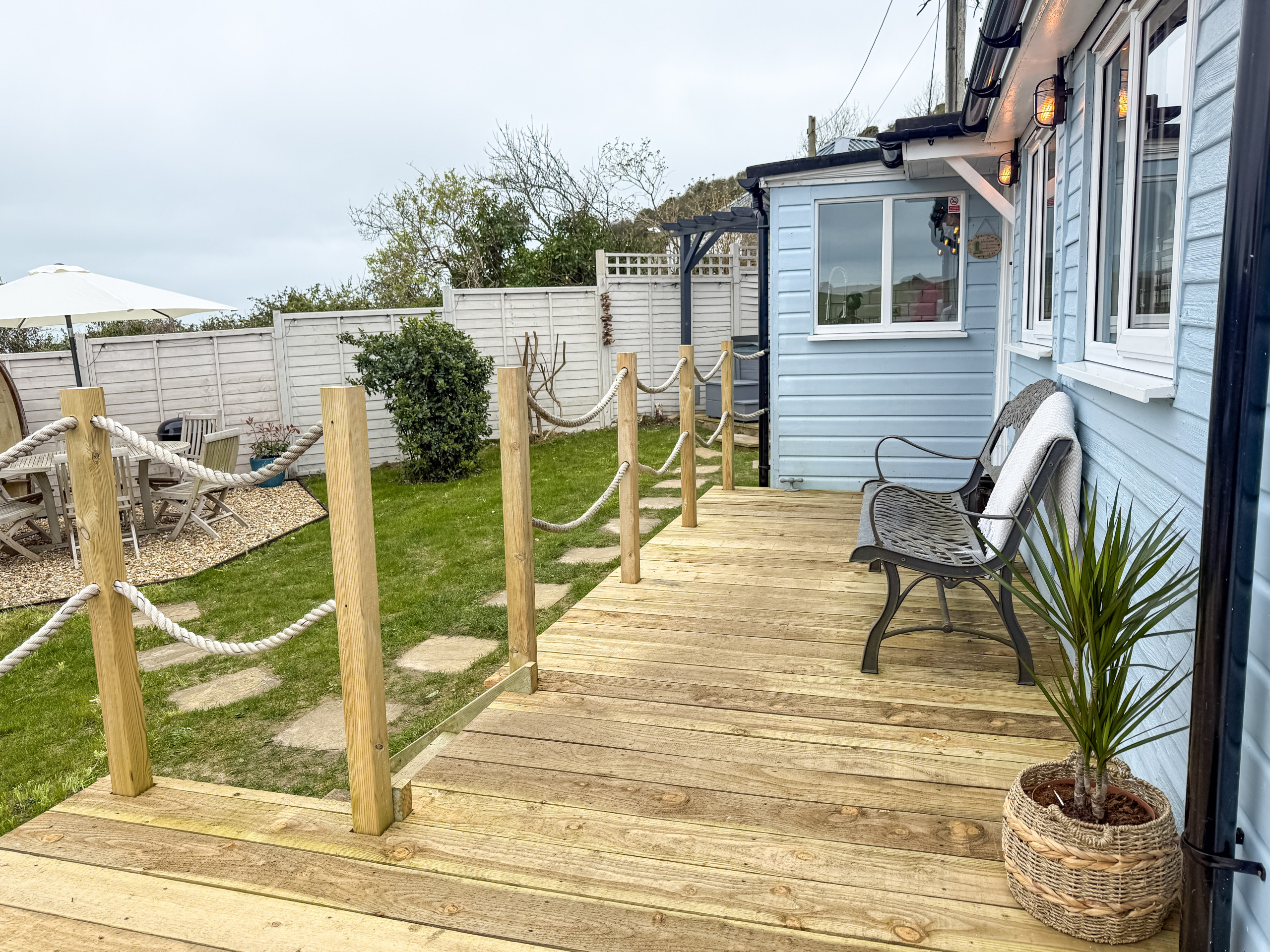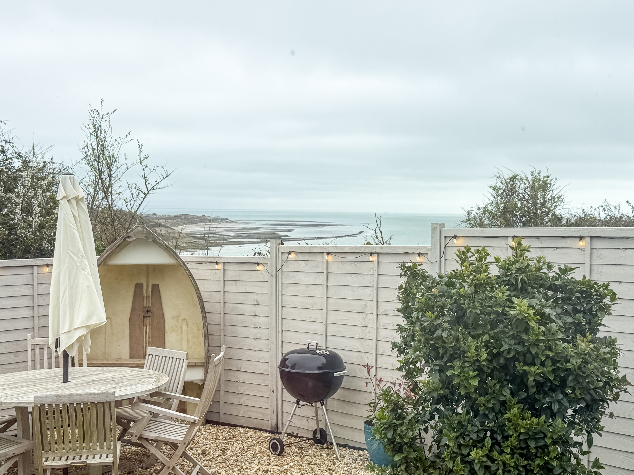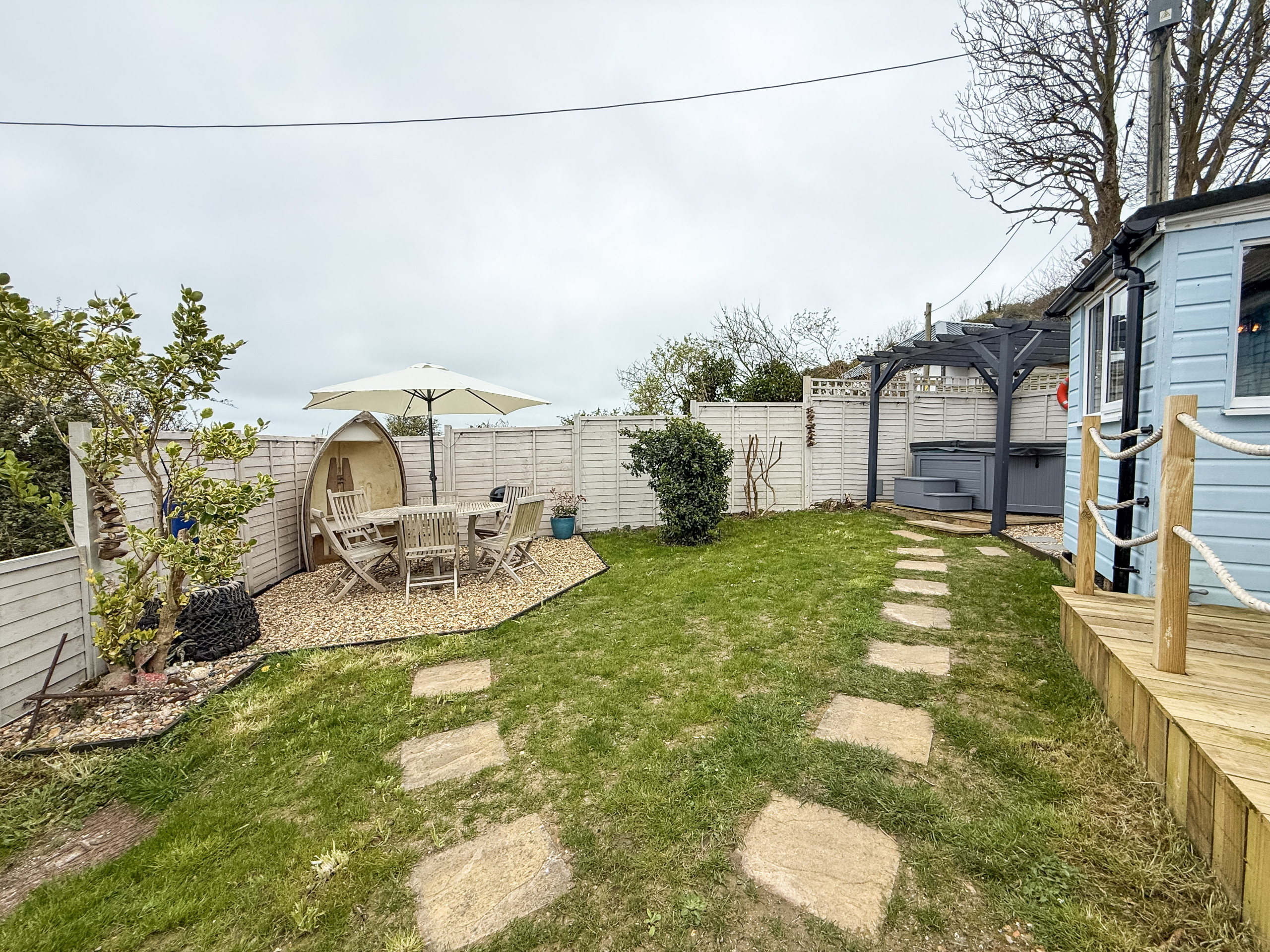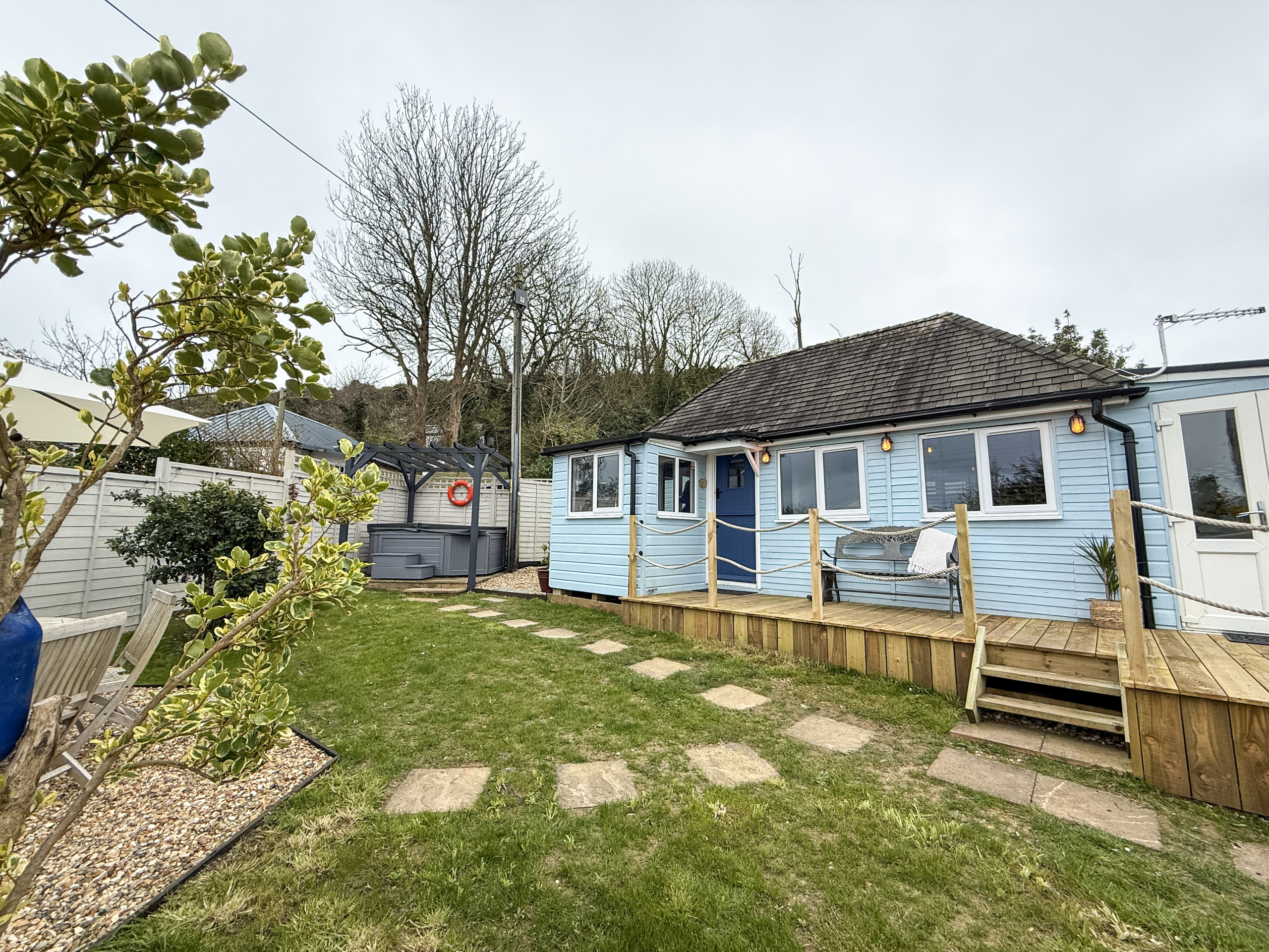 Outside - Set in a peaceful position just outside Whitecliff Bay, the chalet benefits from fresh coastal air and easy access to cliffside walks and the beach below. Outdoor space to enjoy the surroundings.