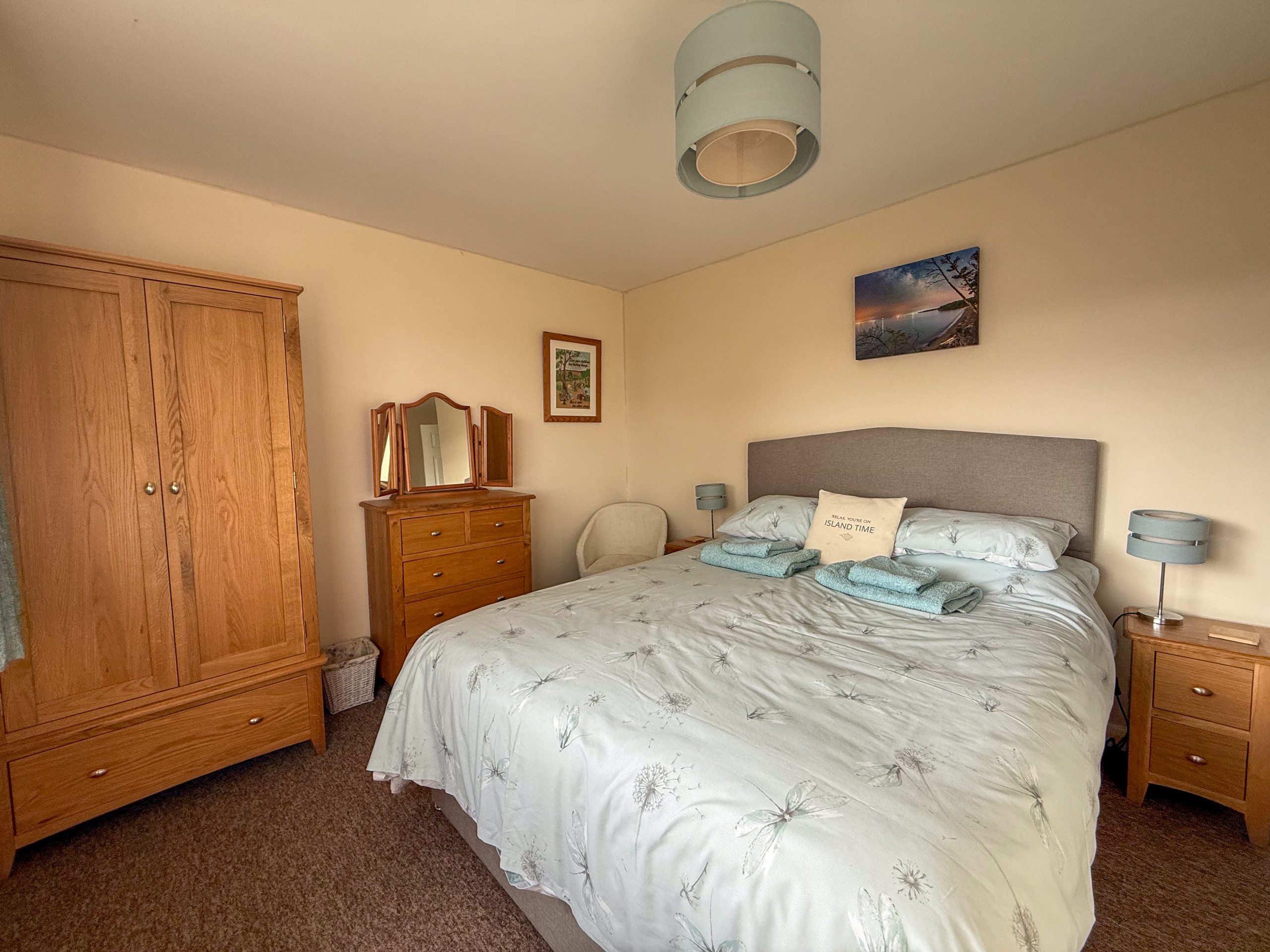 Bedroom 1: King size bed, wardrobe and chest of drawers and a walk in shower.