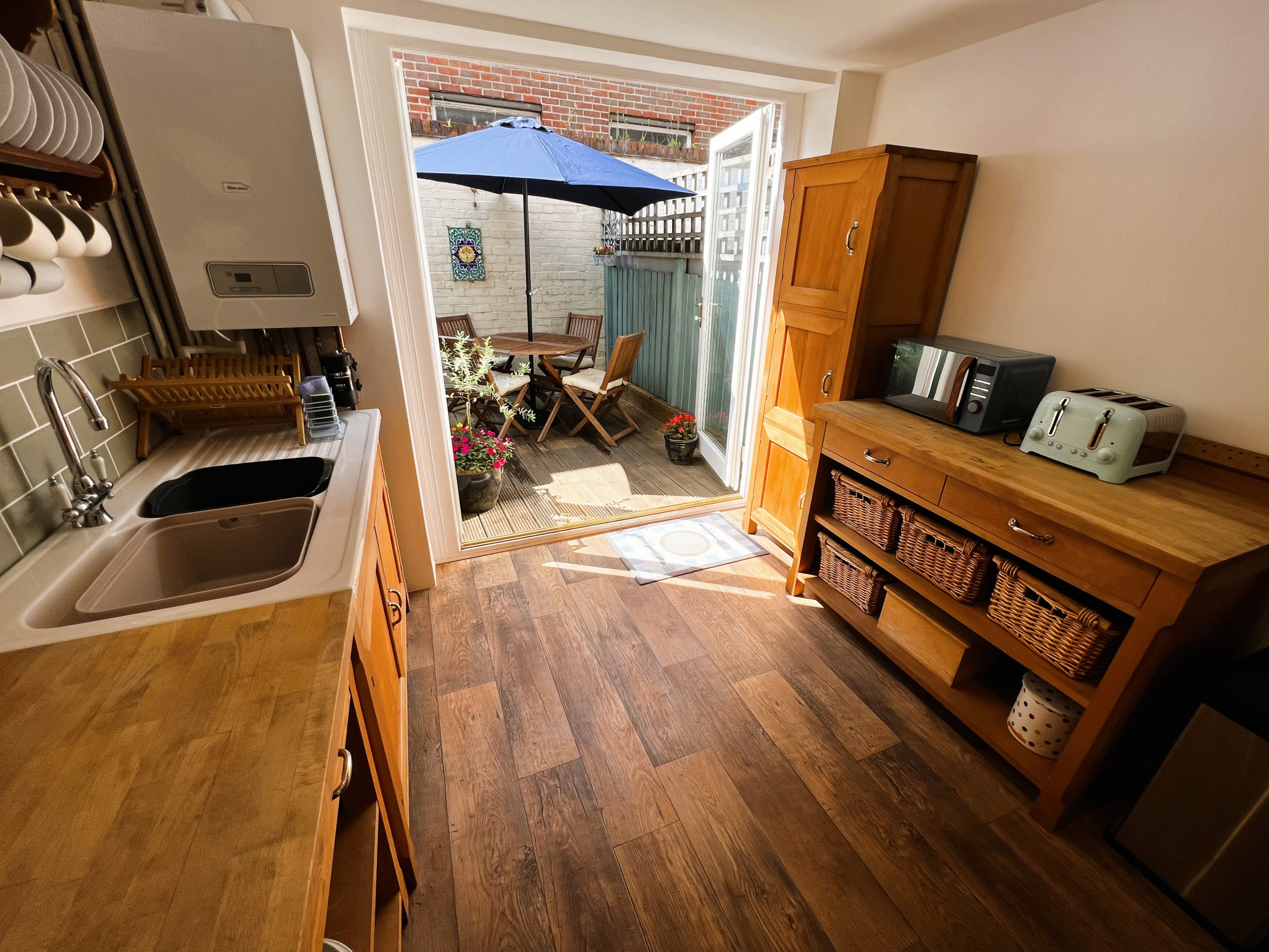 Kitchen: SMEG electric oven, SMEG fridge freezer, microwave, kettle and toaster, French-doors out to rear courtyard.