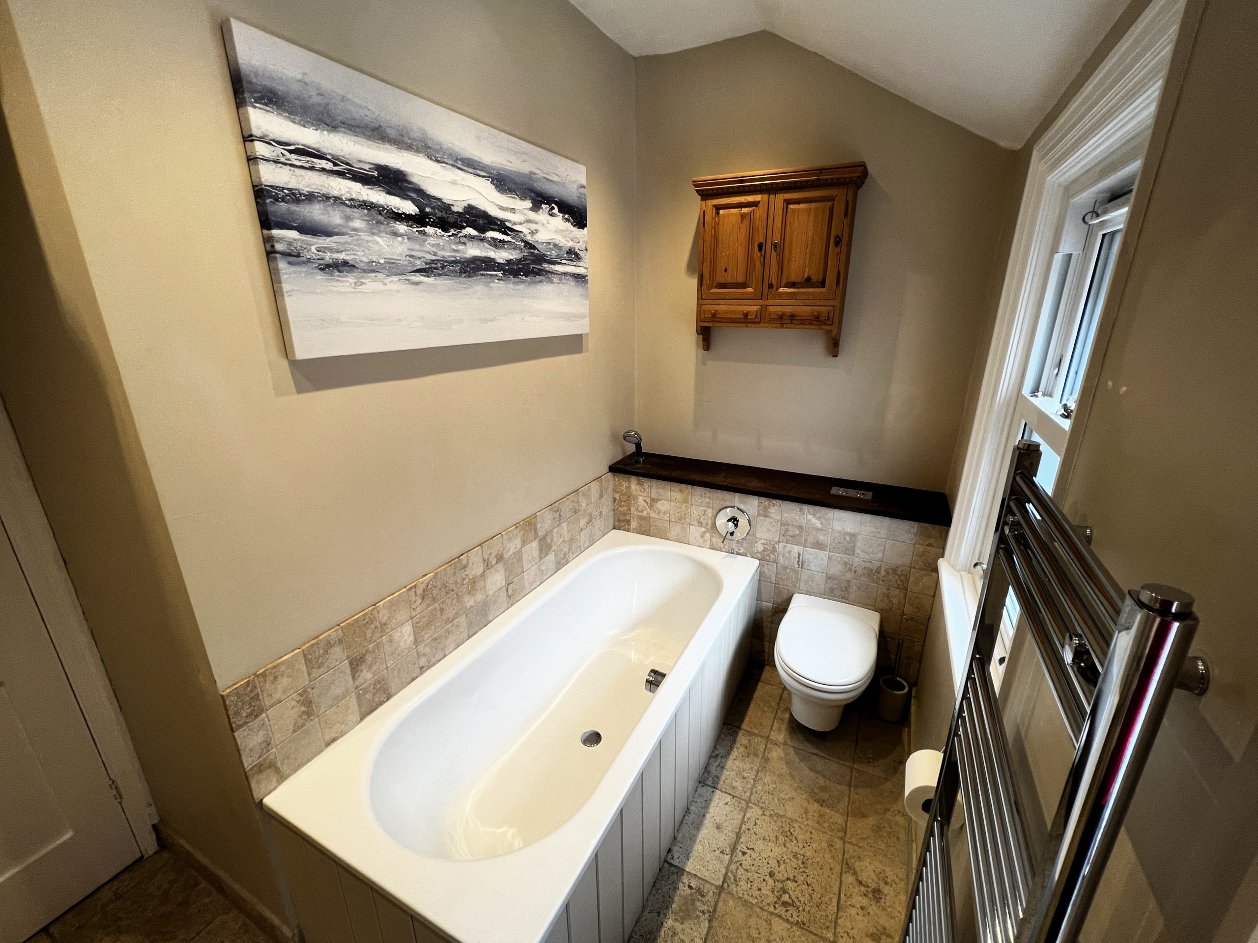 Family bathroom: bath with shower attachment, toilet & pedestal wash hand basin, heated towel rail.