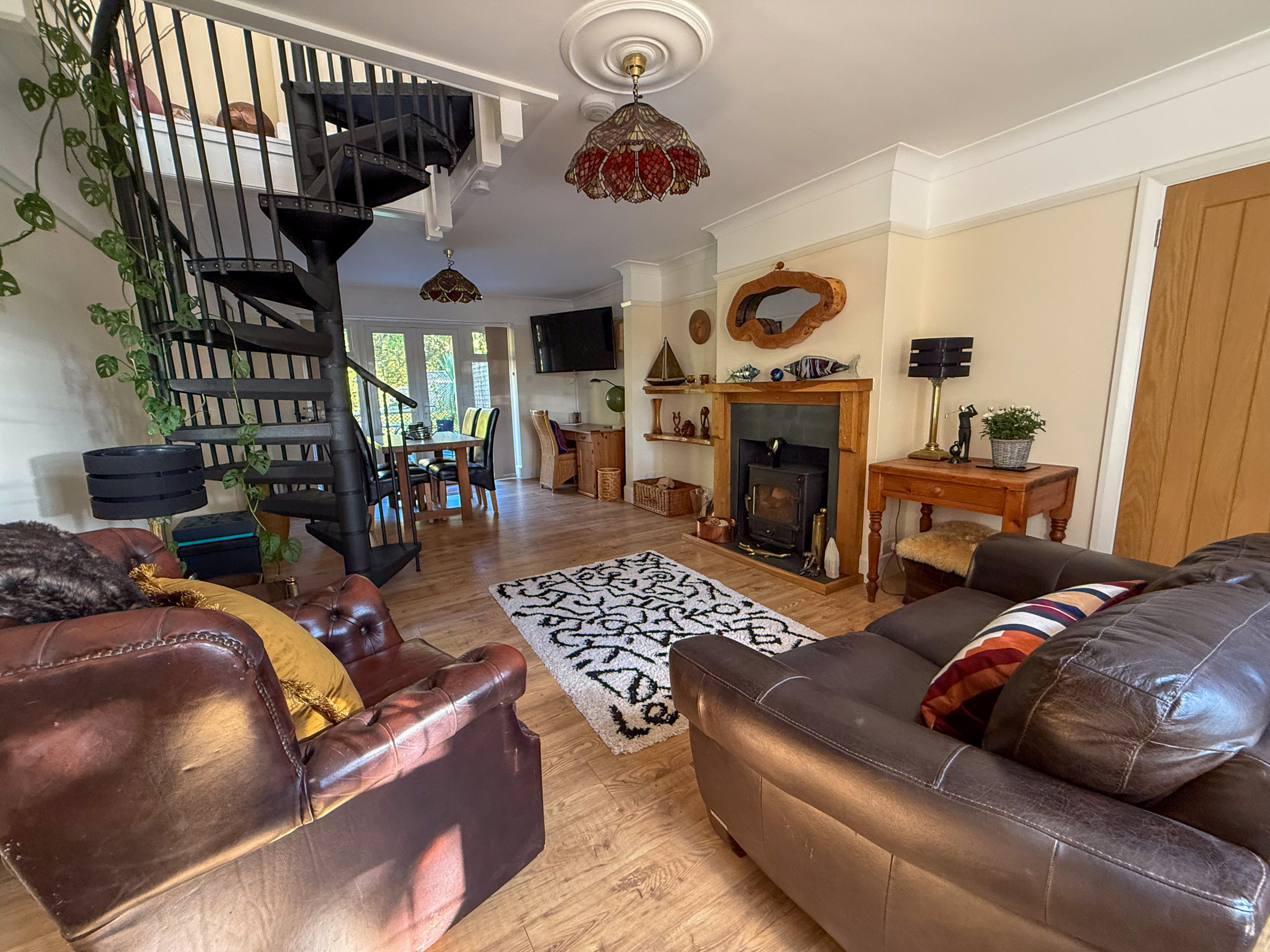 Lounge - 2 seater sofa, armchair, Smart TV, log burner, dining table and 4 chairs.