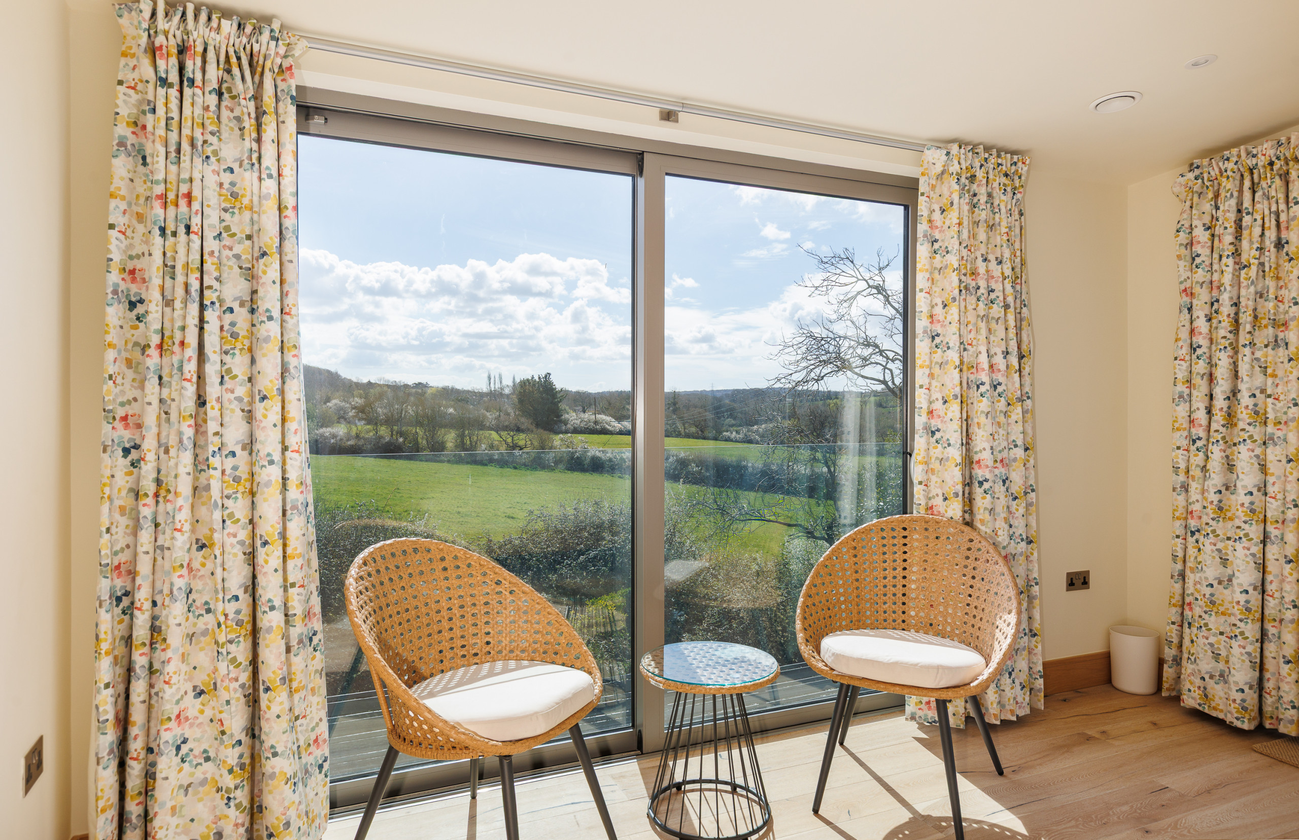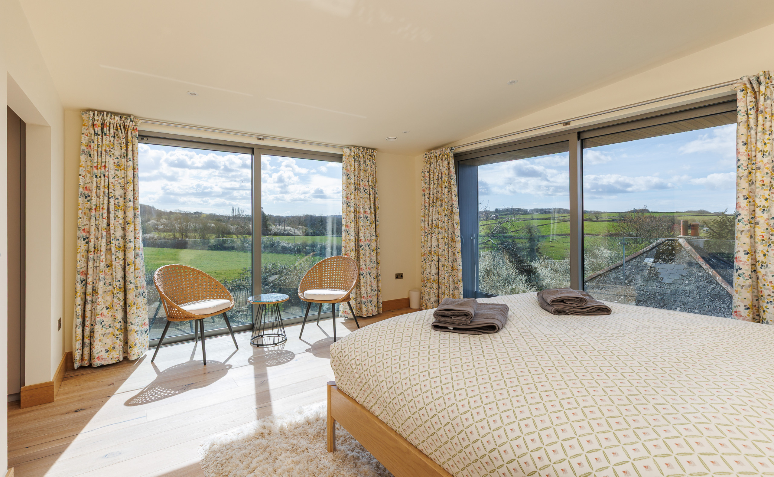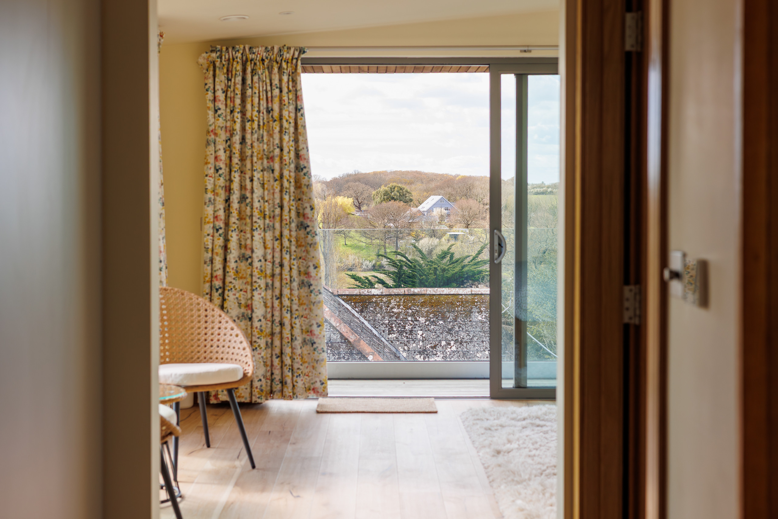 Upstairs, the principal bedroom suite provides a peaceful retreat, complete with a dressing area, en-suite bathroom, and private balcony with countryside views and glimpses of the sea.