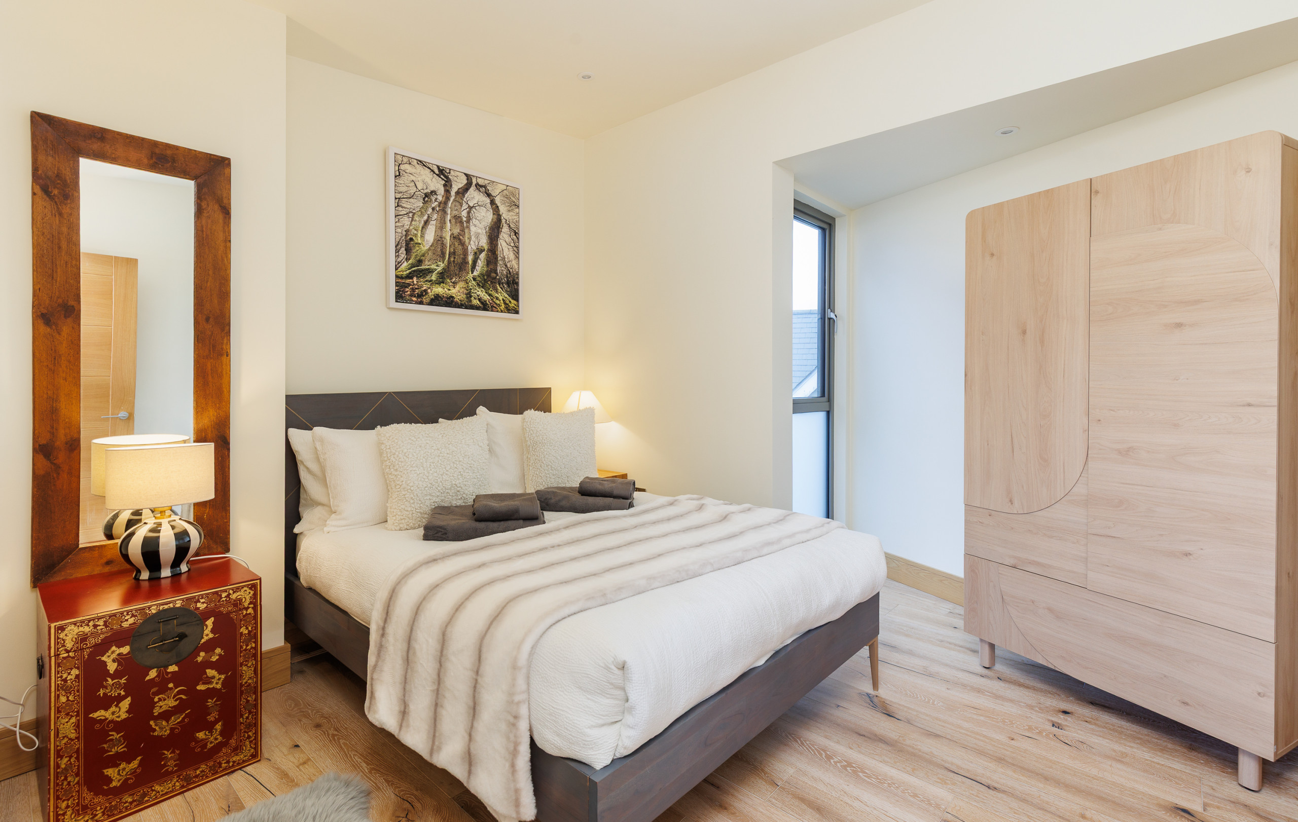 King-size bedroom with built-in wardrobes and doors opening directly onto the rear decking.