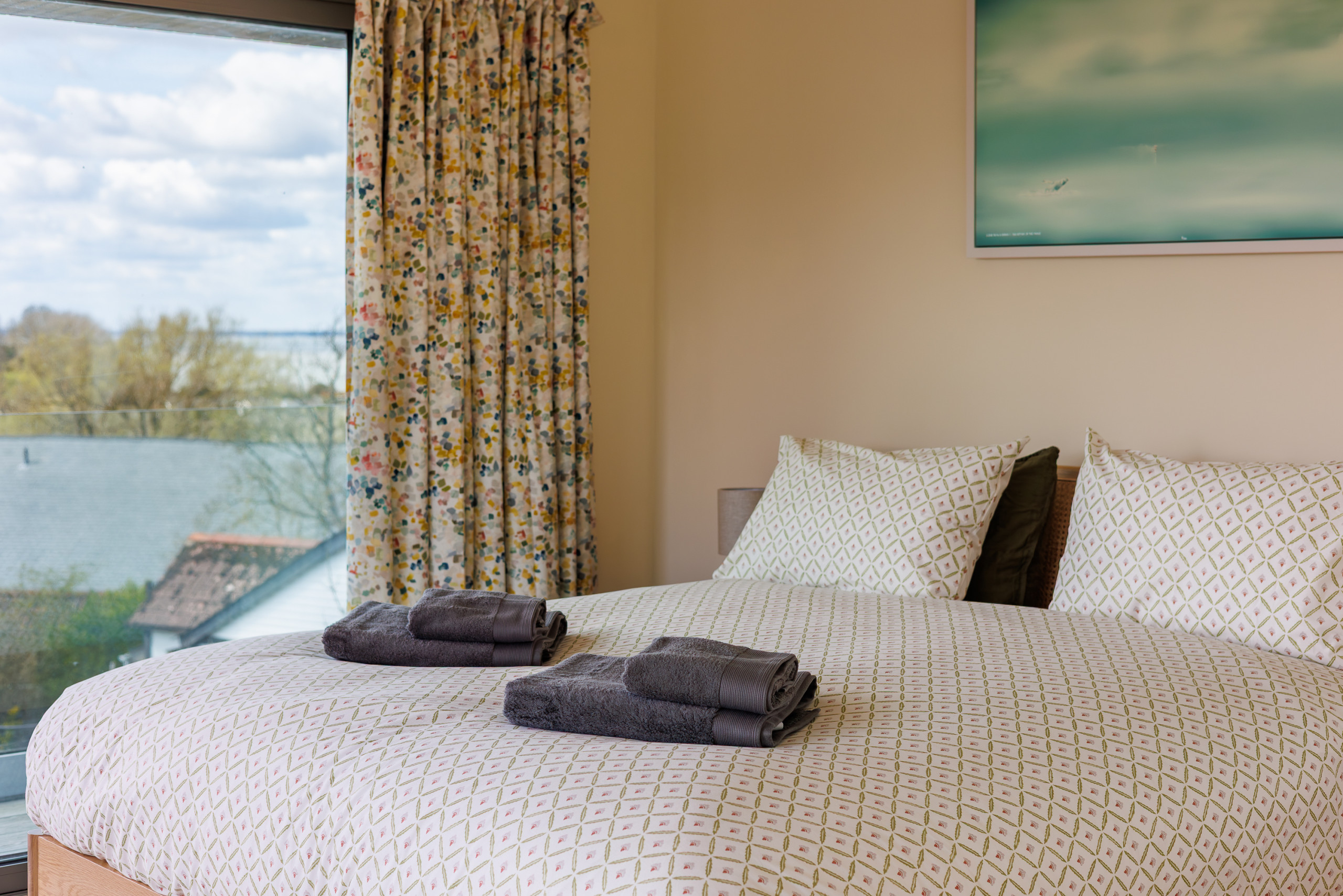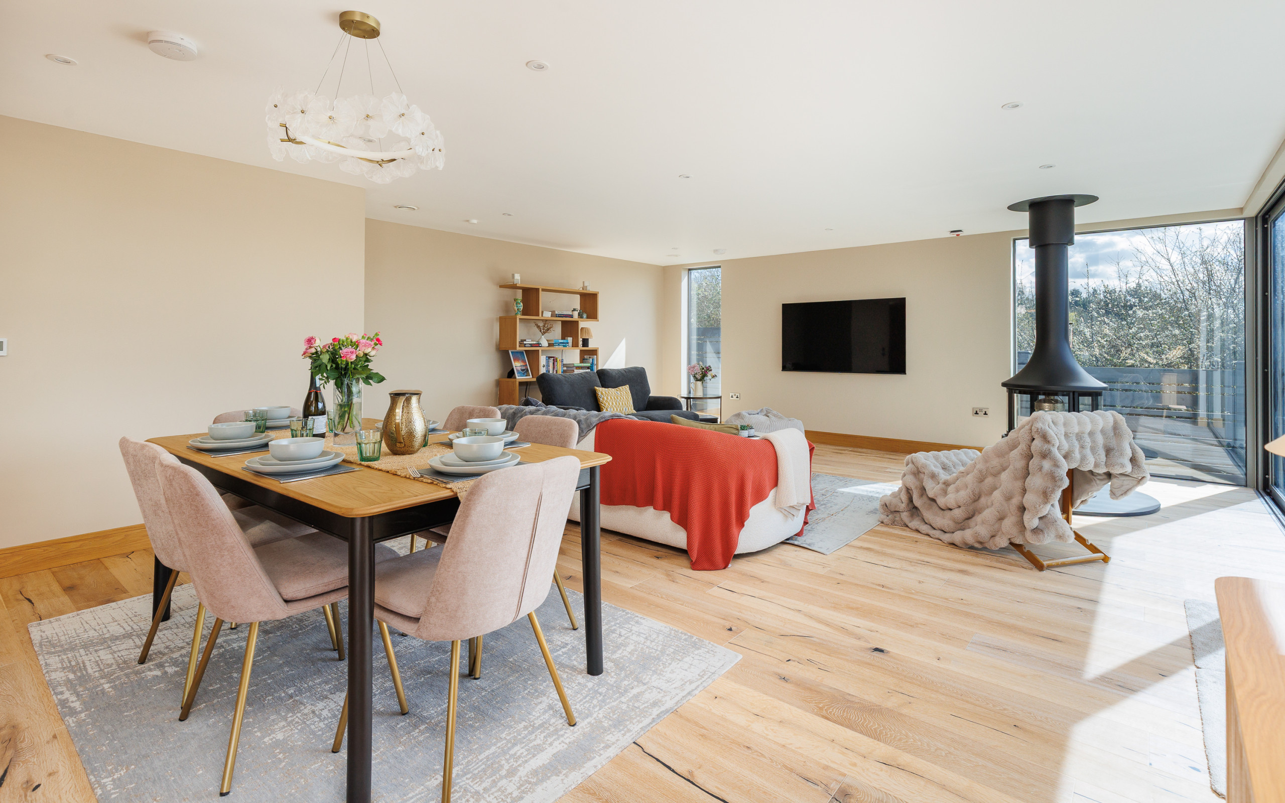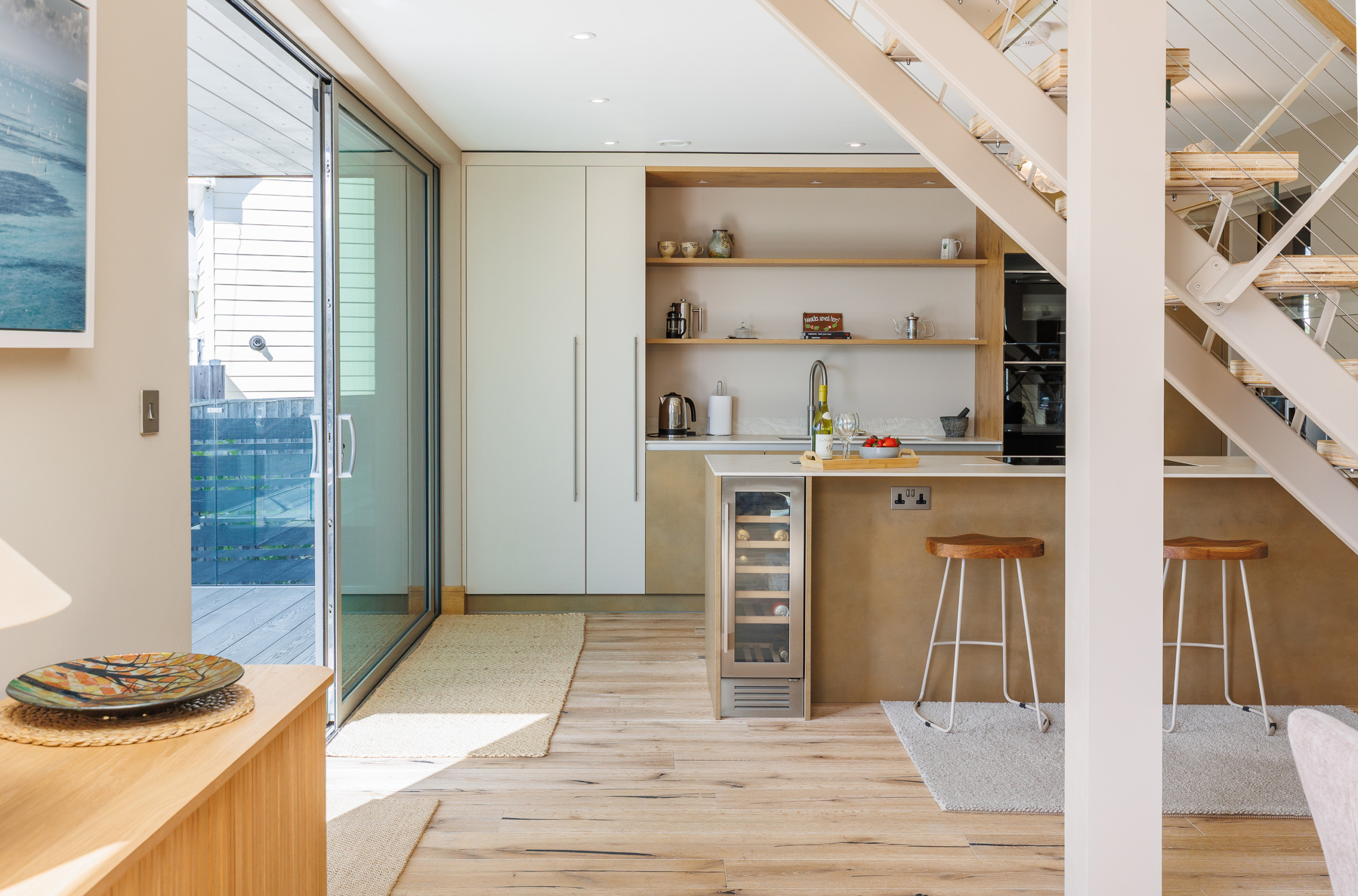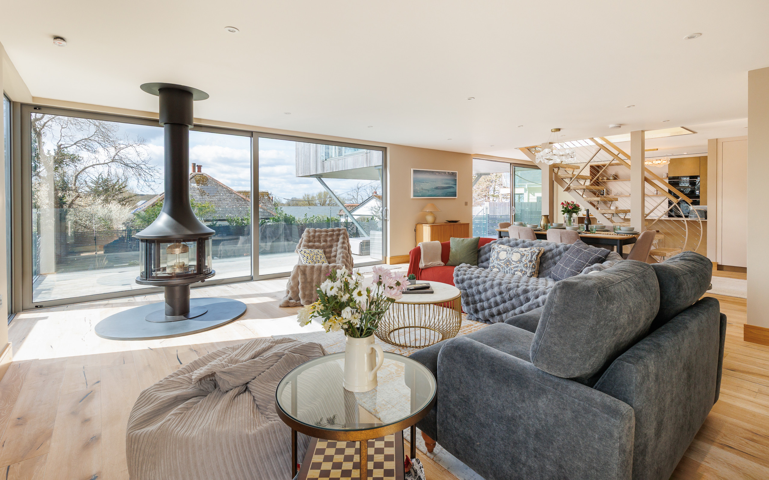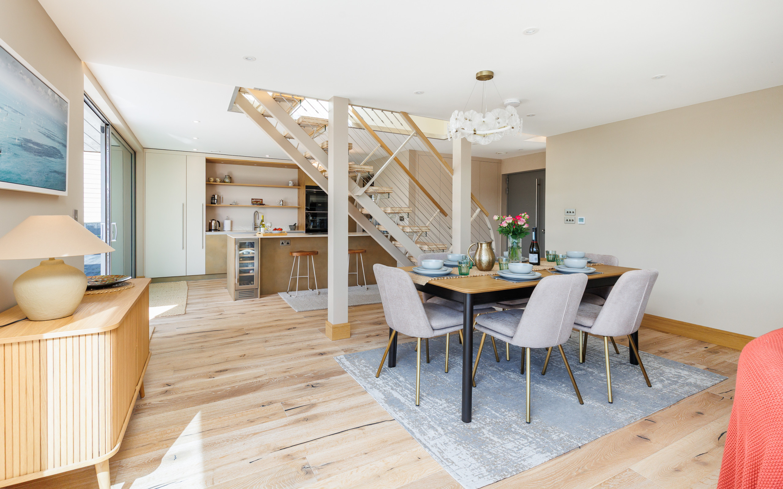Flooded with natural light, The Deck House combines modern Scandinavian-inspired design with relaxed coastal living. The upper-floor open-plan living space has been thoughtfully positioned to showcase the spectacular sea views, allowing you to enjoy the ever-changing Solent from sunrise to sunset — whether you’re dining, relaxing on the sofas, or stepping outside onto the balcony with a morning coffee or evening drink.