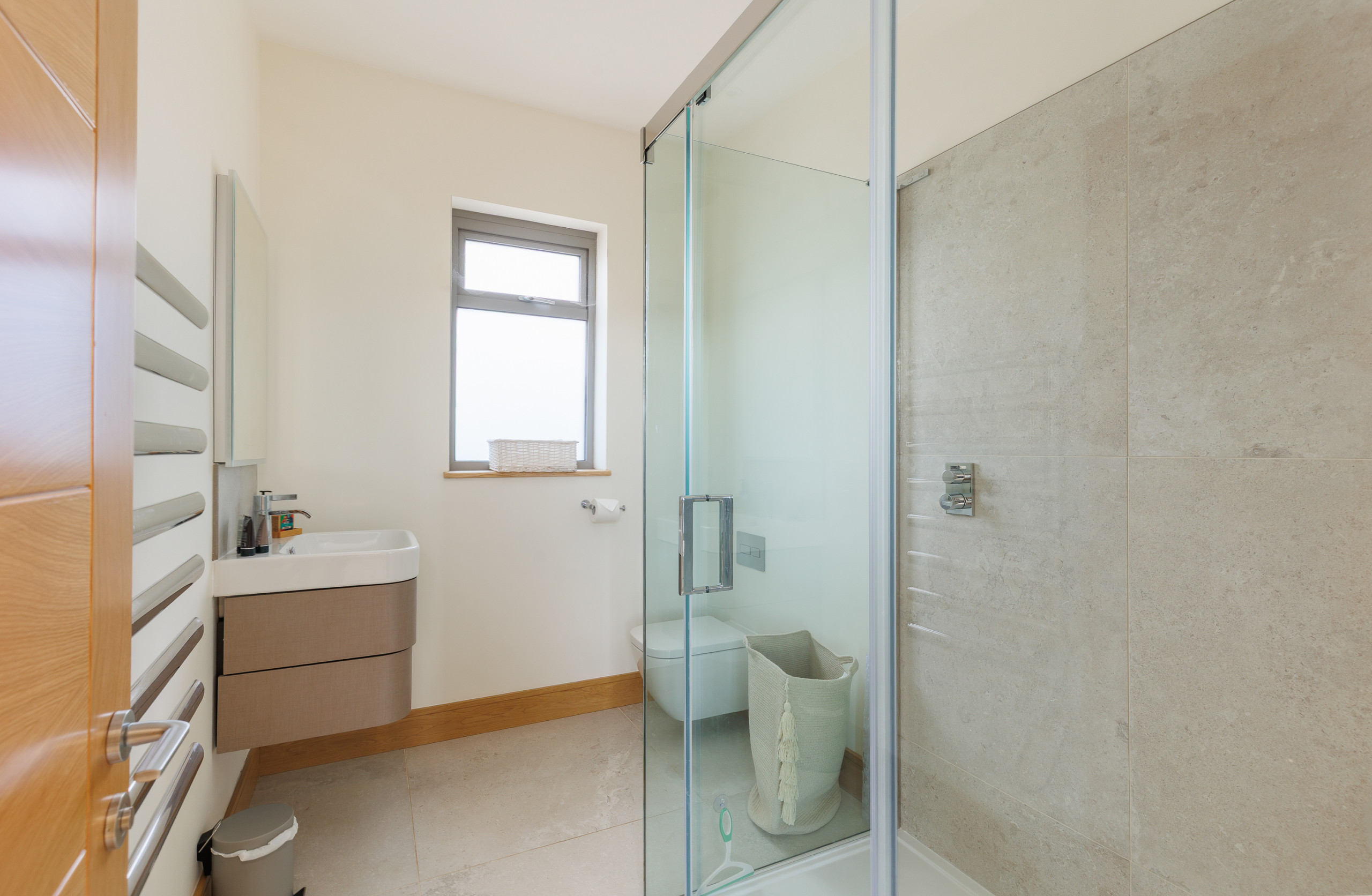 Shower, WC, hand basin, and heated towel rail.