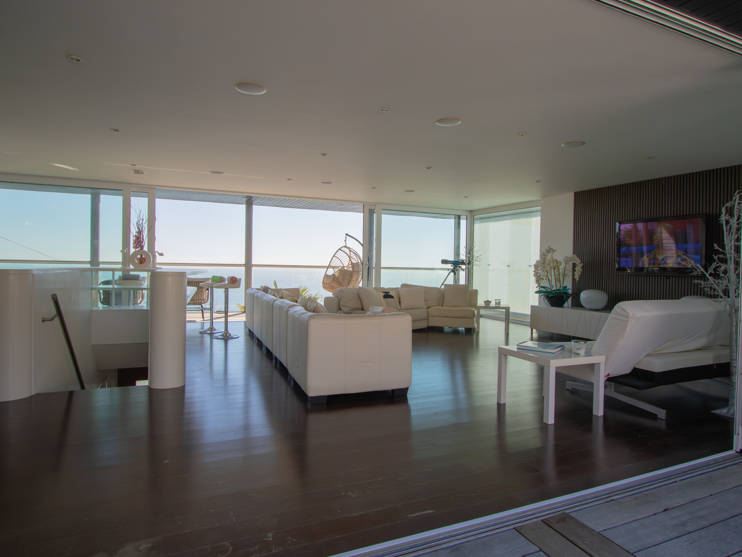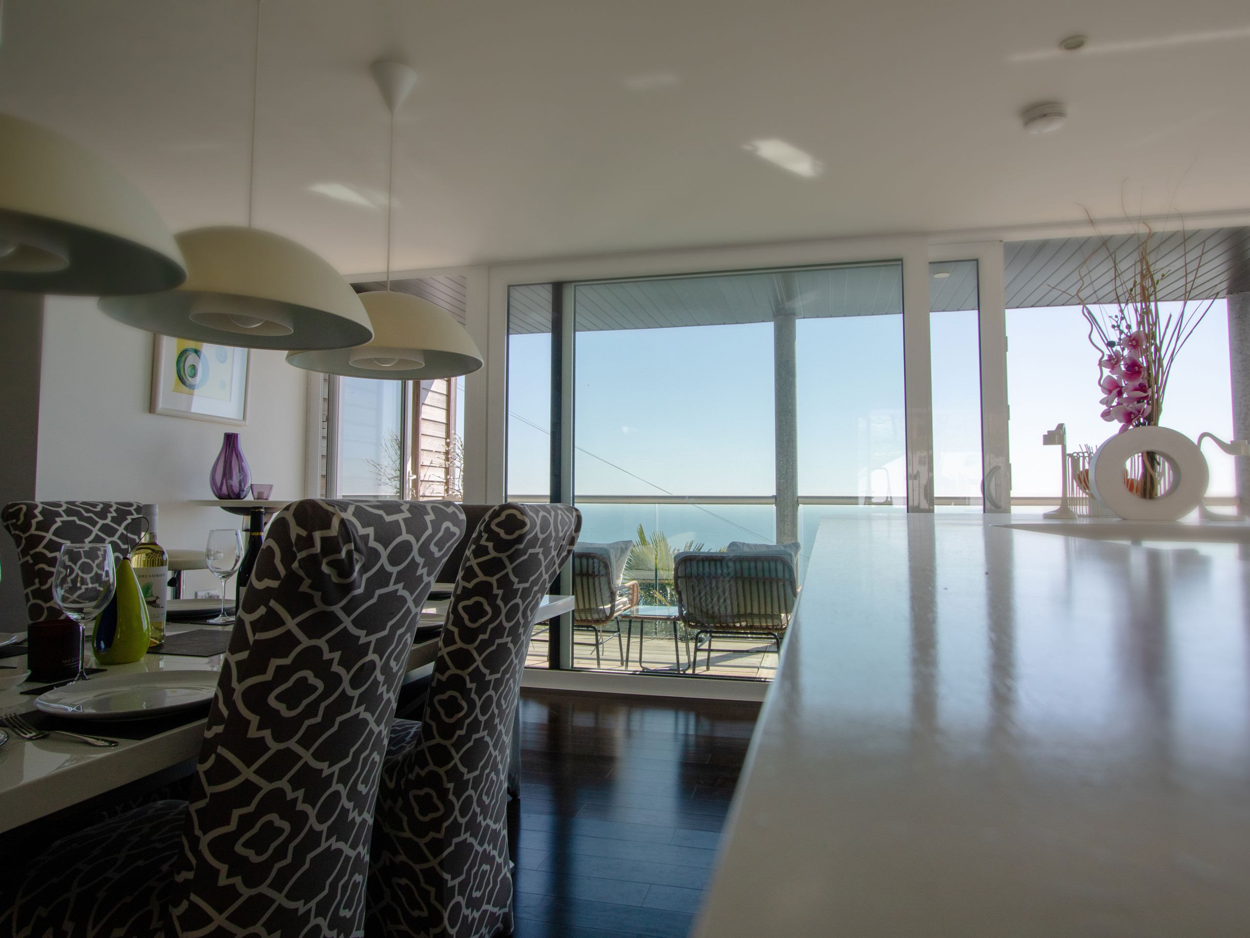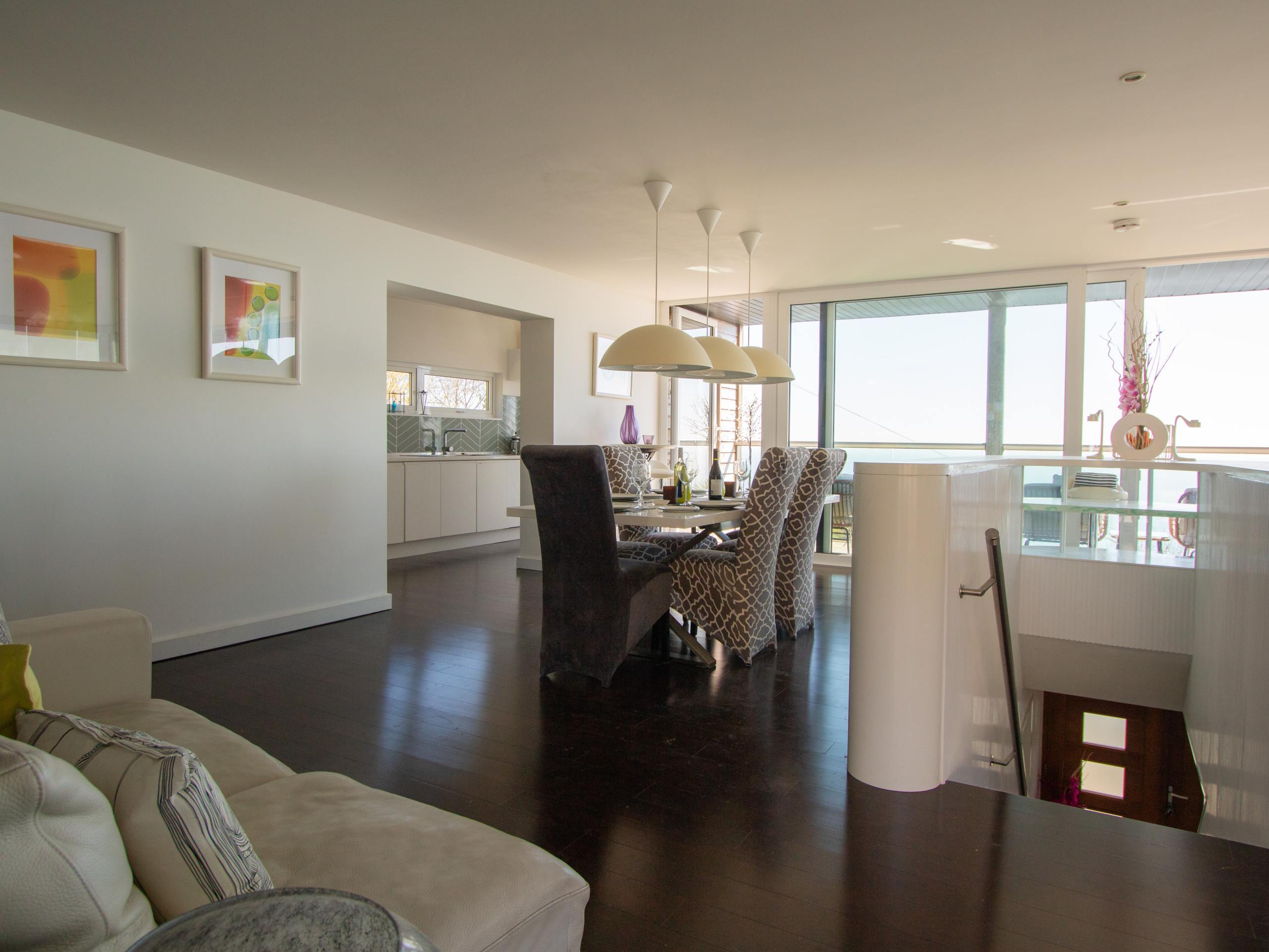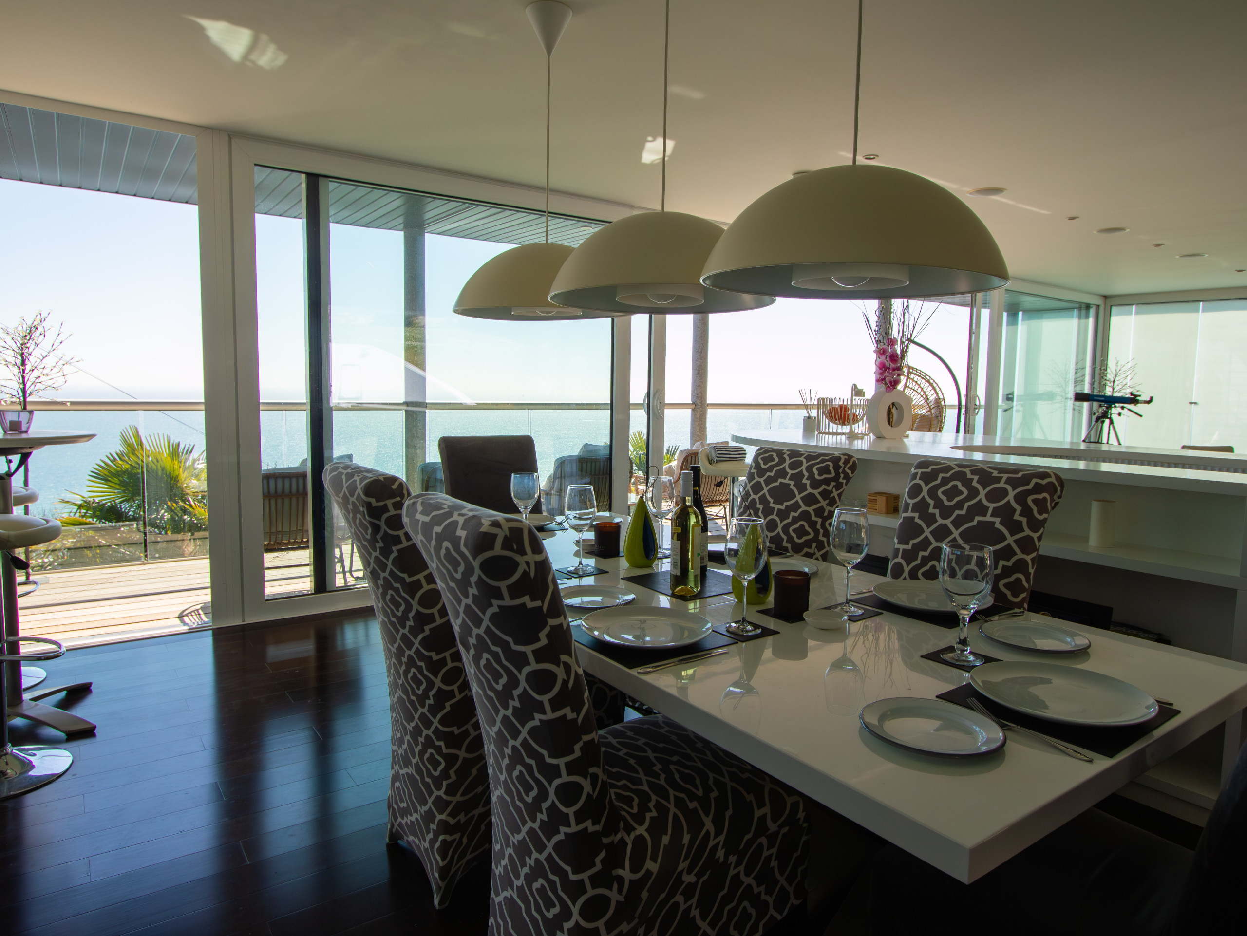 Lounge / Kitchen / Dining Area (First Floor) Open-plan living space with comfortable seating, dining area and patio doors leading to a sea-view balcony.