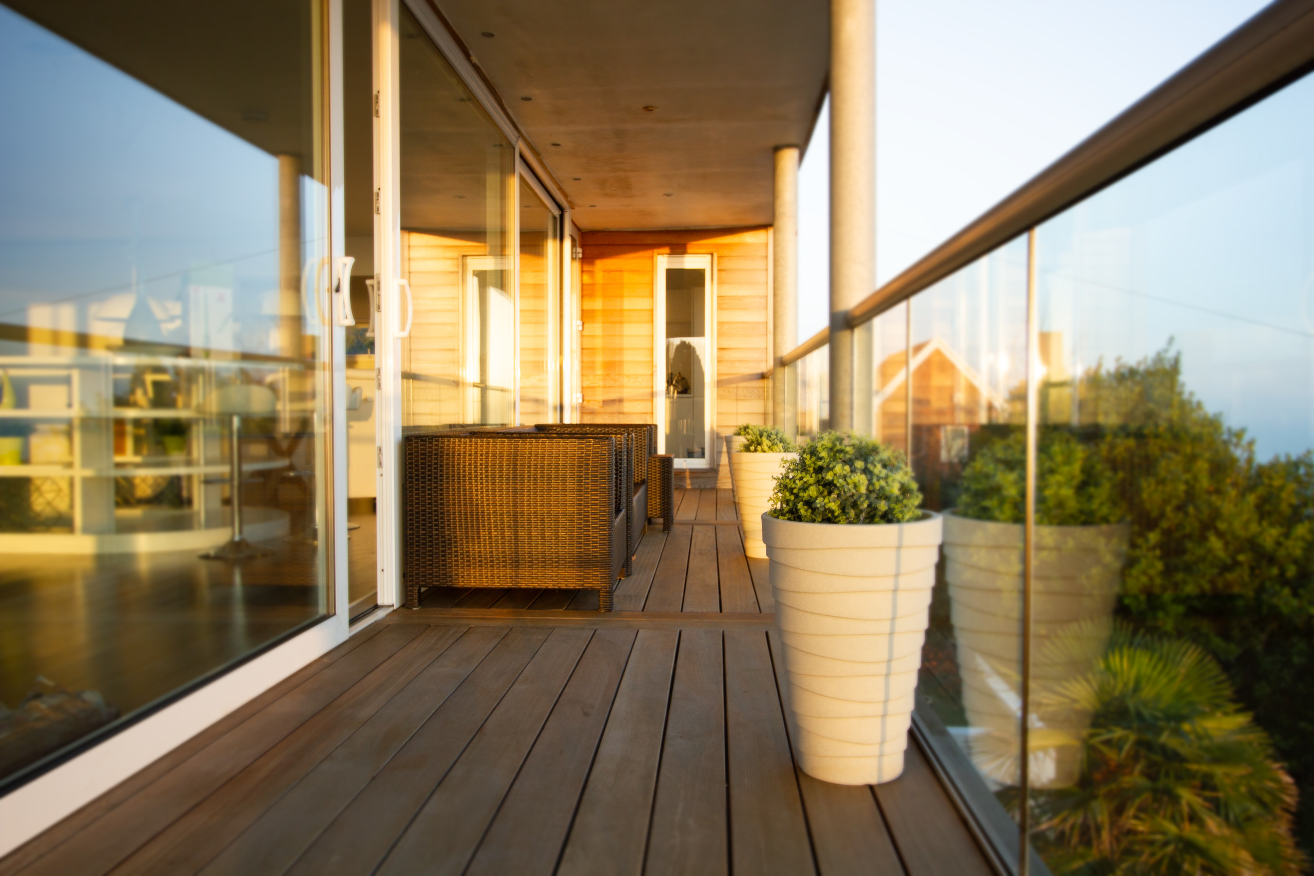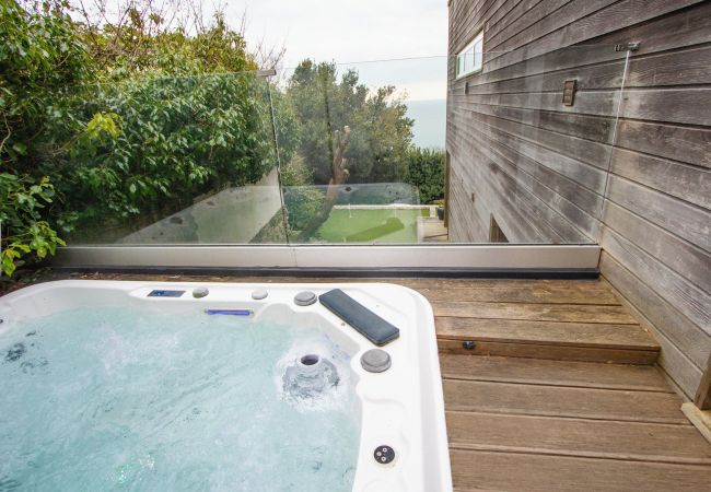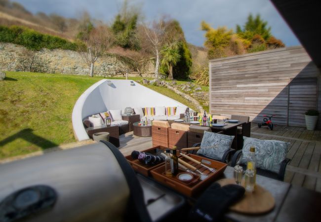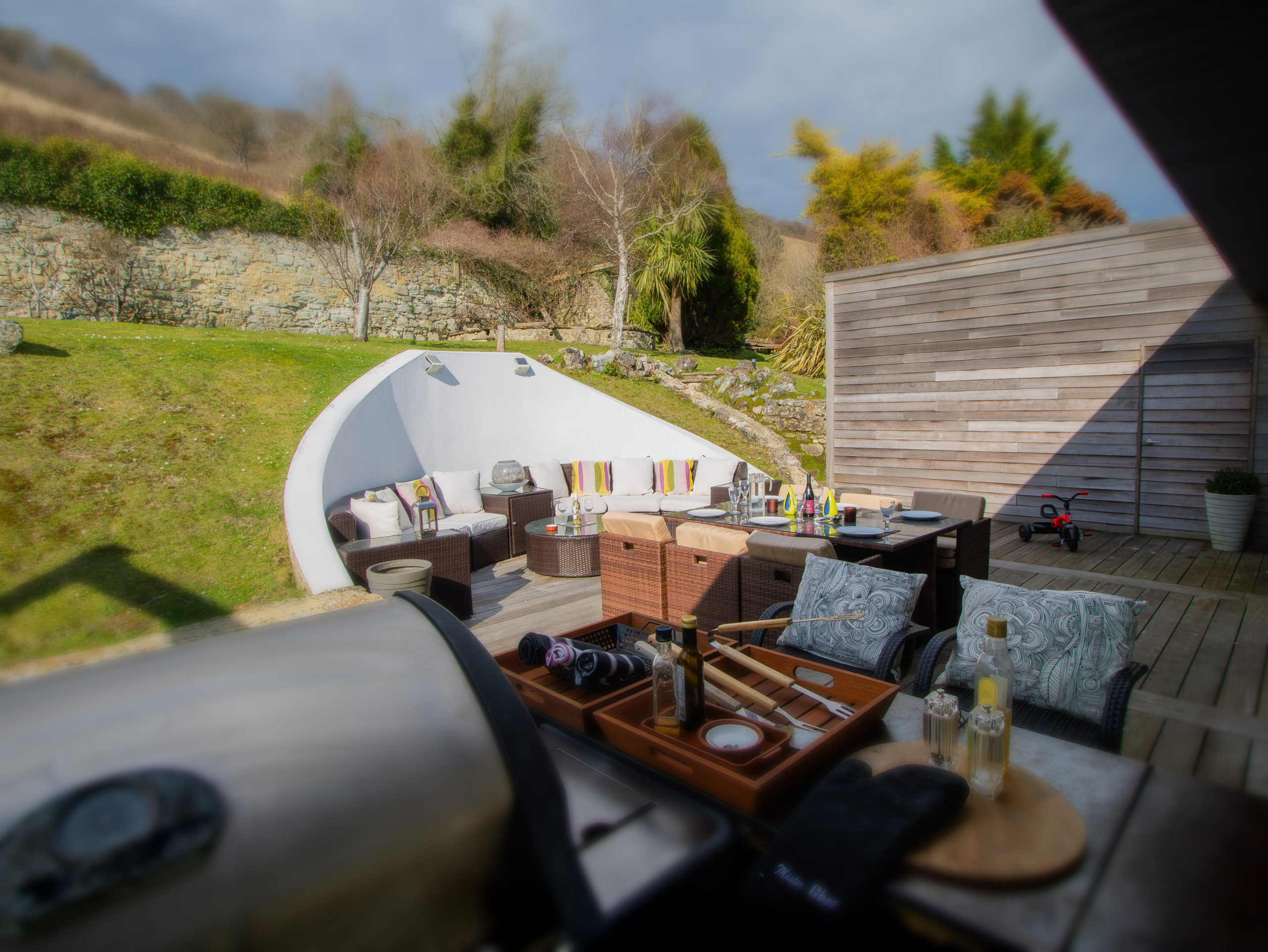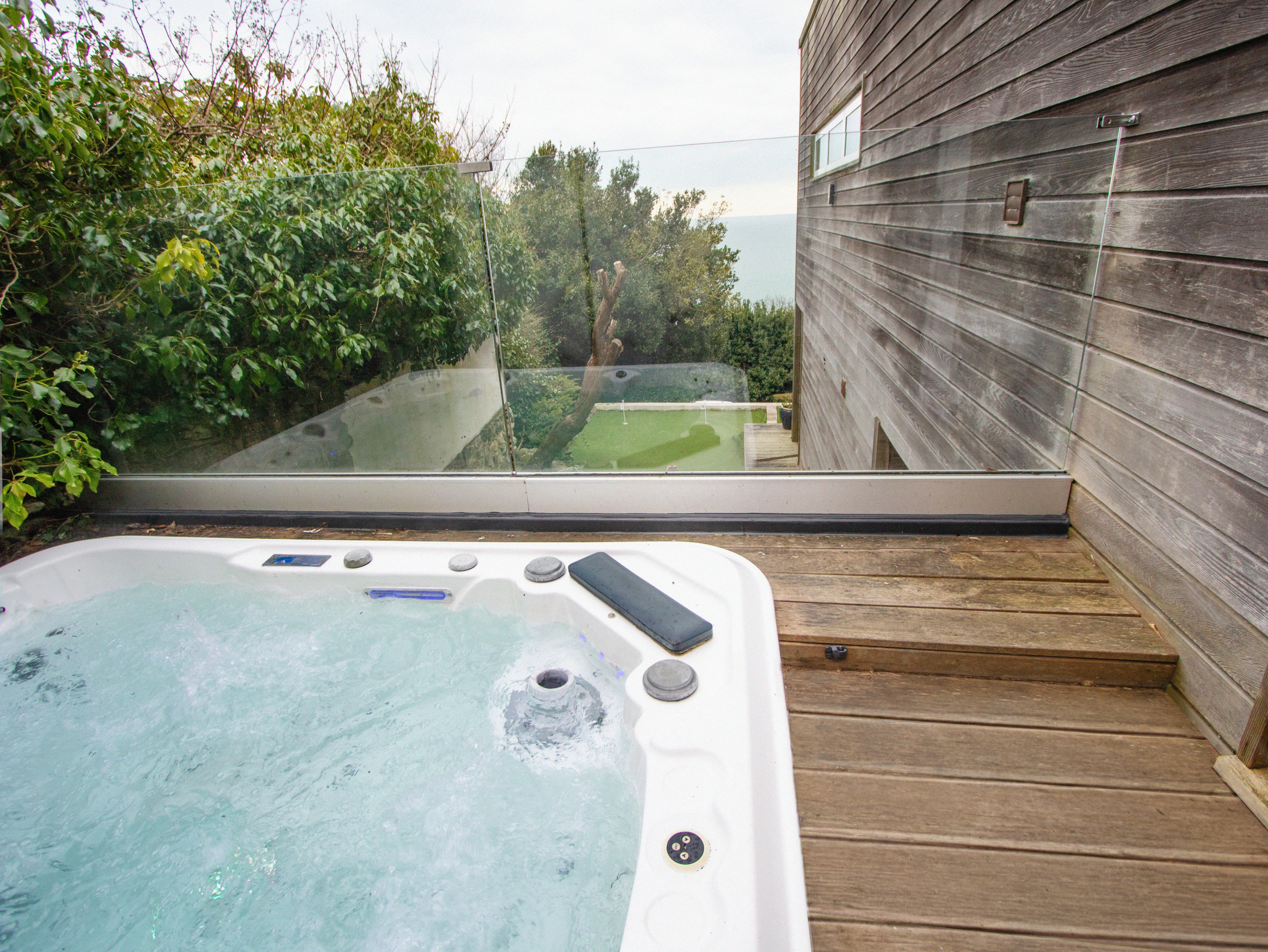 Outside - Private landscaped garden with decking, BBQ, putting green and hot tub. Balcony with seating and panoramic sea views.