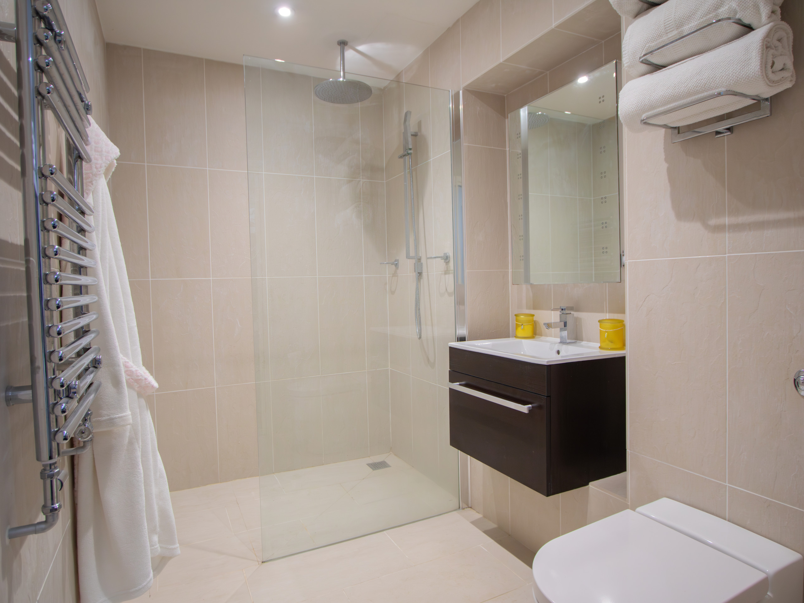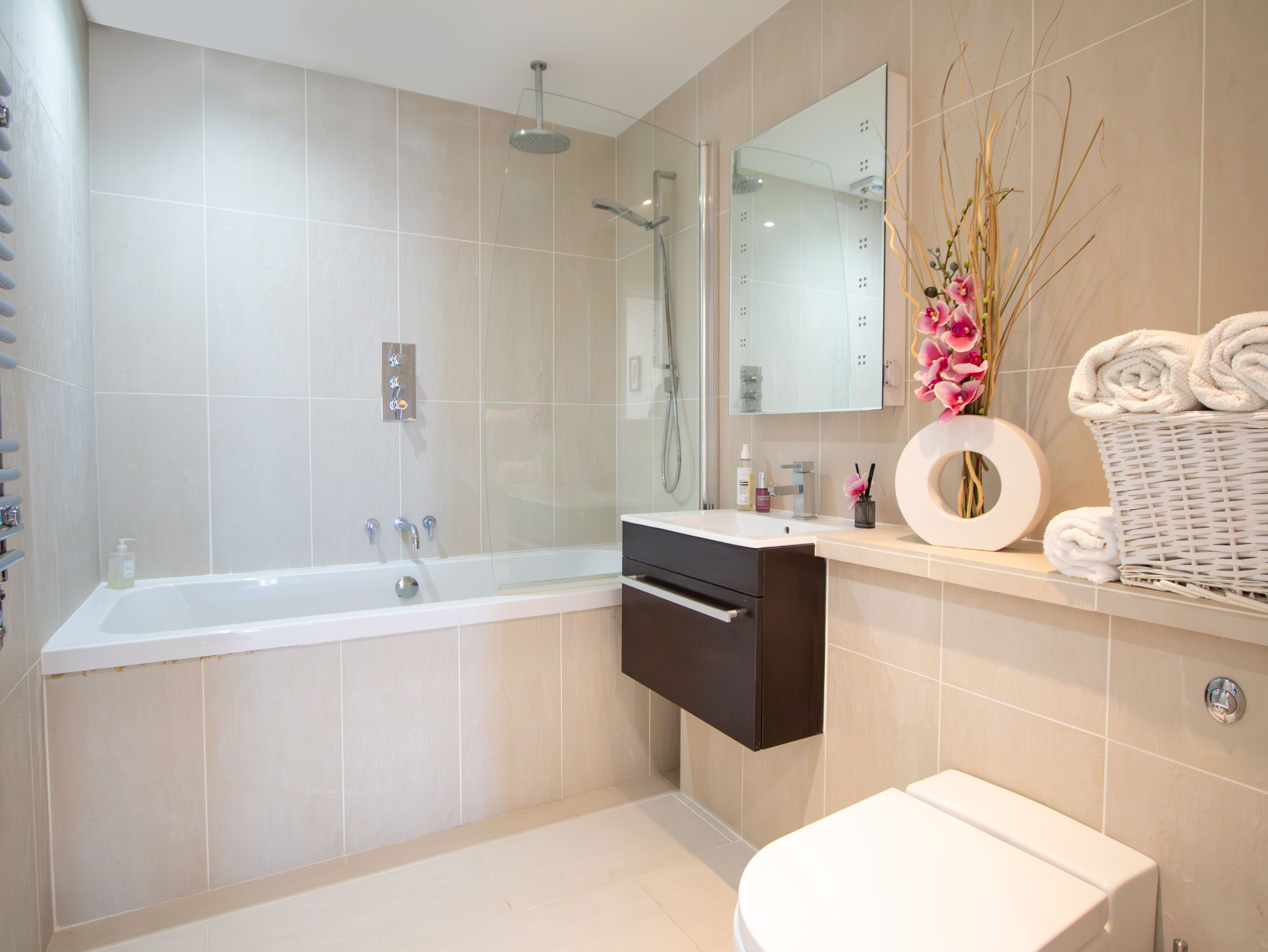 Family Bathroom - Contemporary bathroom with bath, shower, WC and wash hand basin.