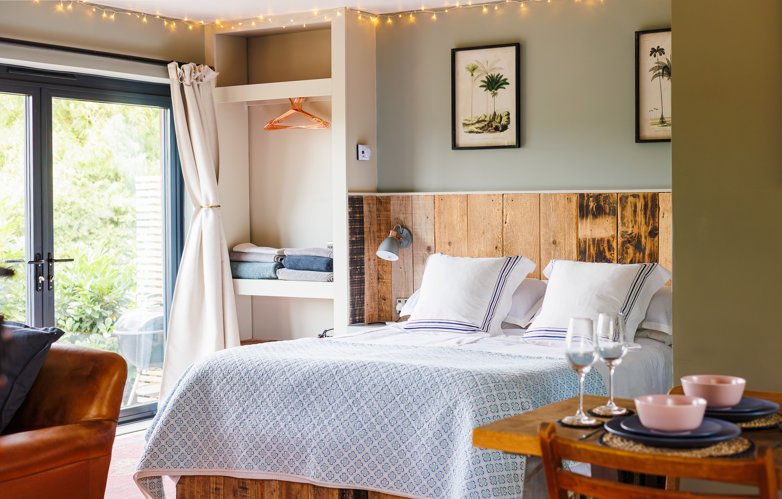 Inside, you’ll find stylish finishes, natural textures, and warm wooden accents that create an inviting, lived-in atmosphere. The space is open-plan yet cleverly laid out, featuring a double bed, a well-equipped kitchenette, and a shower room — all wrapped in a soothing, countryside-inspired palette.