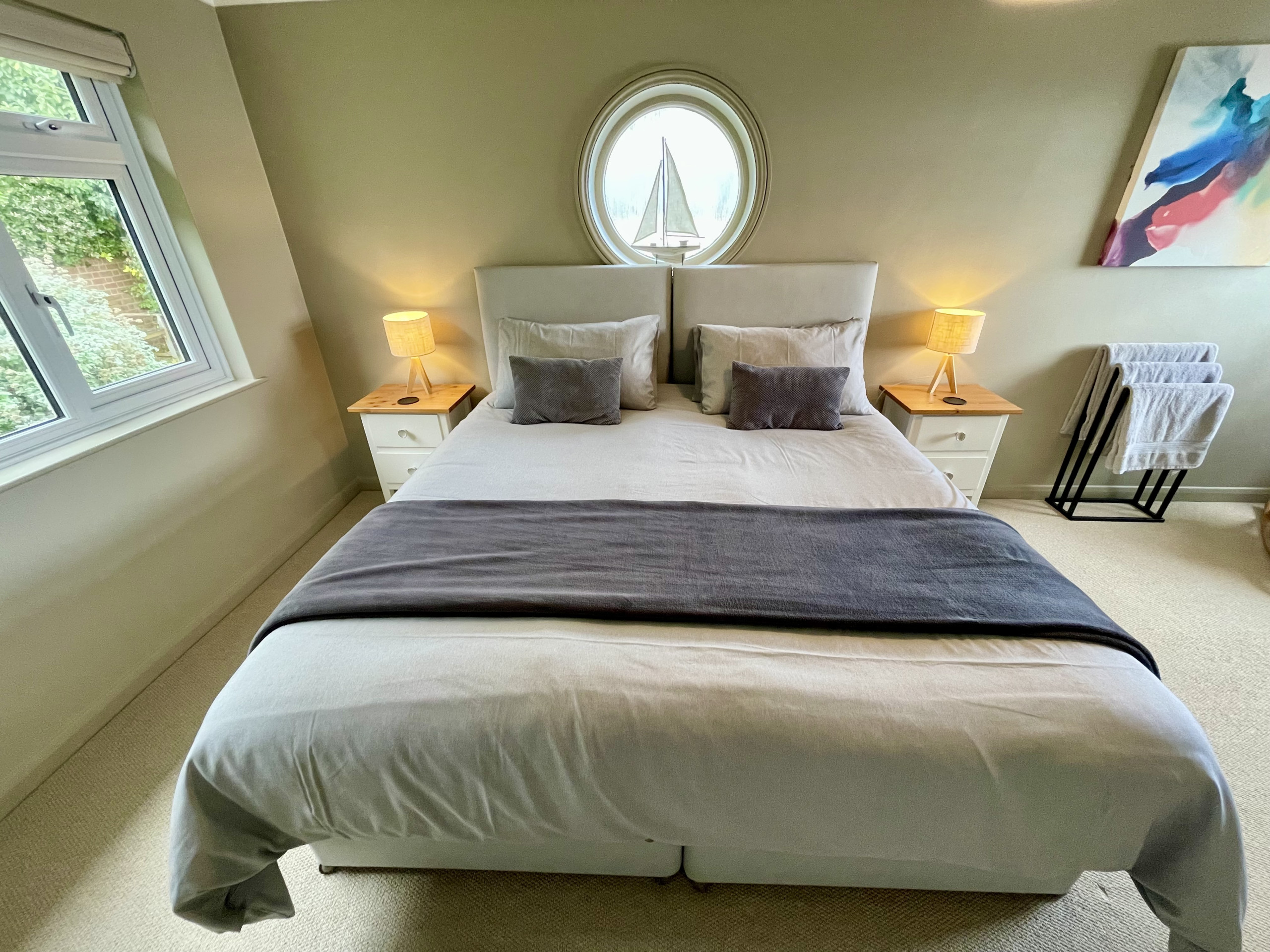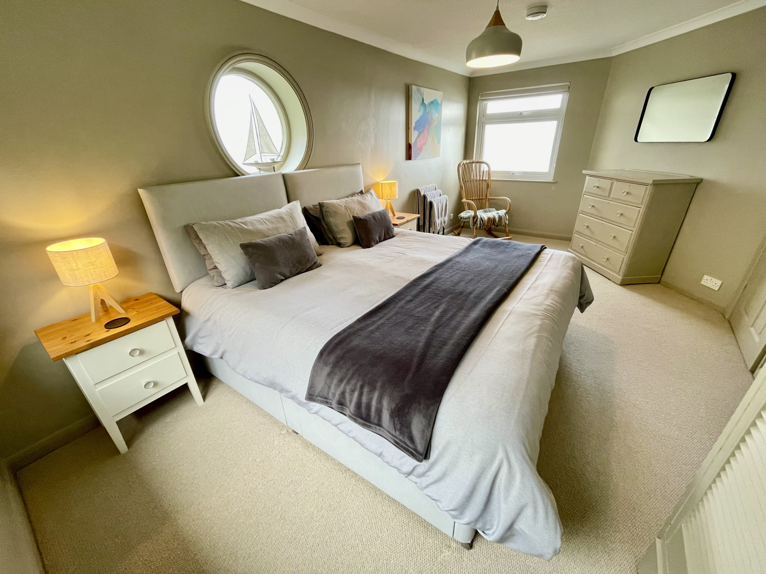 Bedroom 3: Zip-and-link super king bed (can be made into twin beds on request), fitted wardrobes, chest of drawers, Smart TV, towel rail, rocking chair, porthole window and sea views