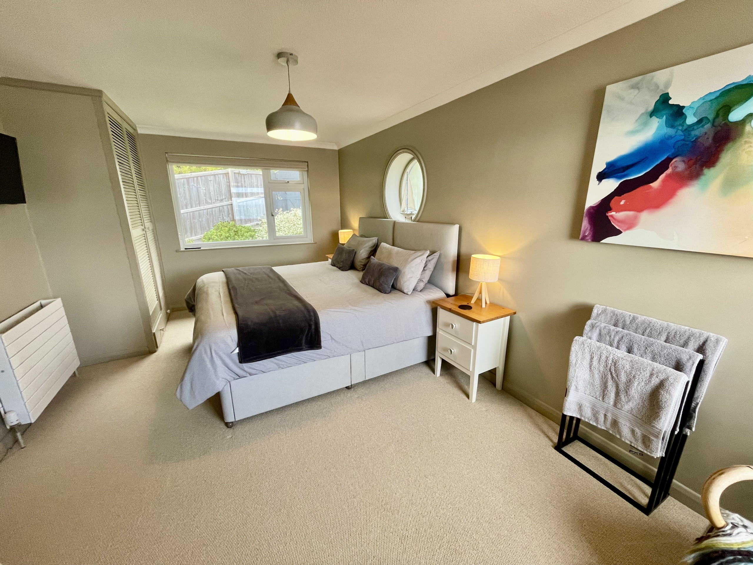 Master bedroom: King-size bed, wardrobes, dressing table, Smart TV (apps only, no aerial) and stunning sea views