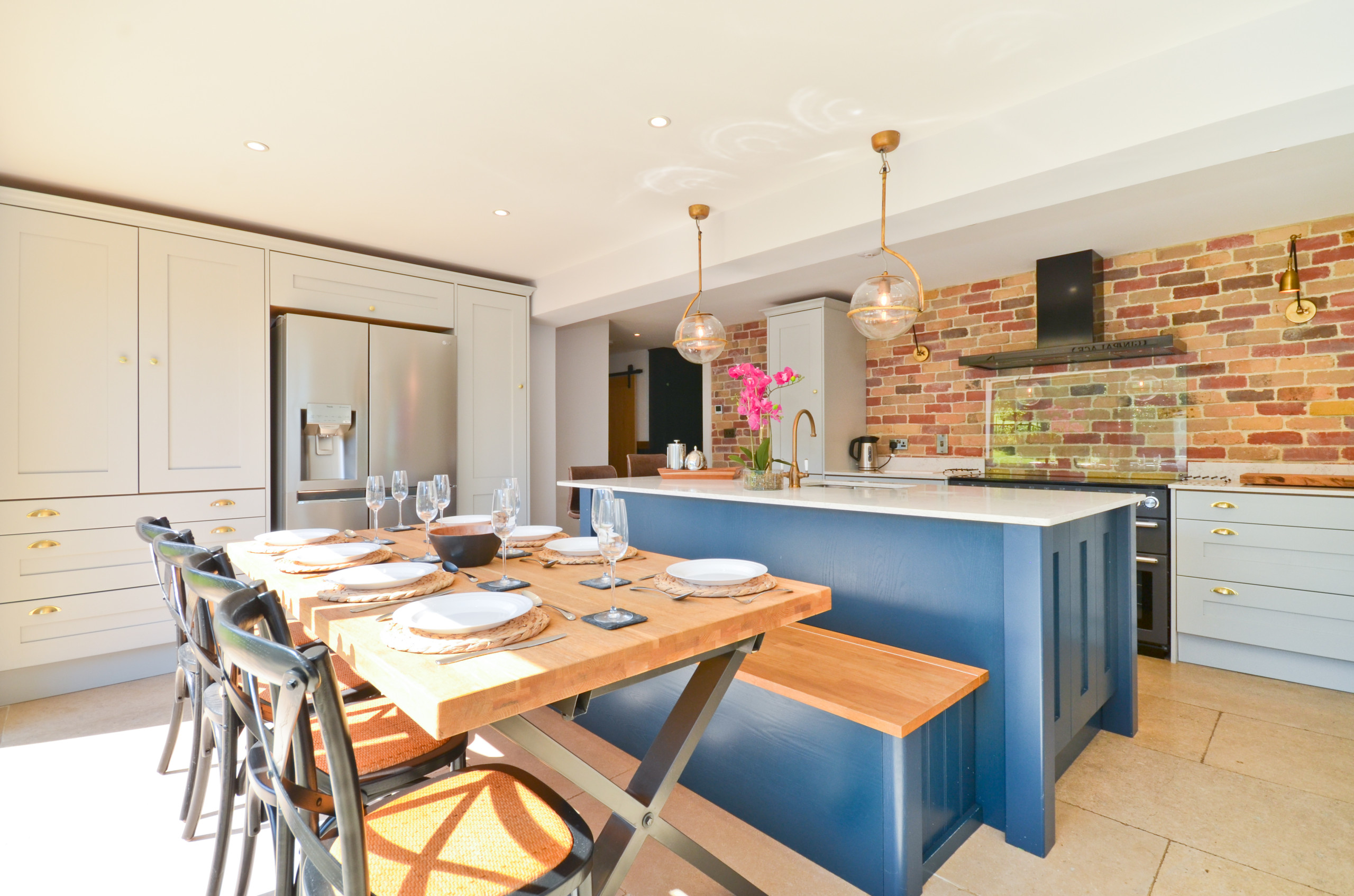 Lounge: large corner sofa and armchairs coffee tables, Smart TV, log burner (Access to the snug is through the lounge only) Snug: 2-seater sofa serves as a small double sofa bed (available as an alternative sleeping option) coffee table, Smart TV Open plan Kitchen/diner. Dining table with four chairs and four-seater bench, Kitchen Area: Central Island unit with sink and dishwasher fitted beneath. American style fridge/freezer, electric range oven with hob, kettle, microwave toaster. Utility room: butler sink, washing machine, tumble dryer, iron and ironing board, single door to garden.