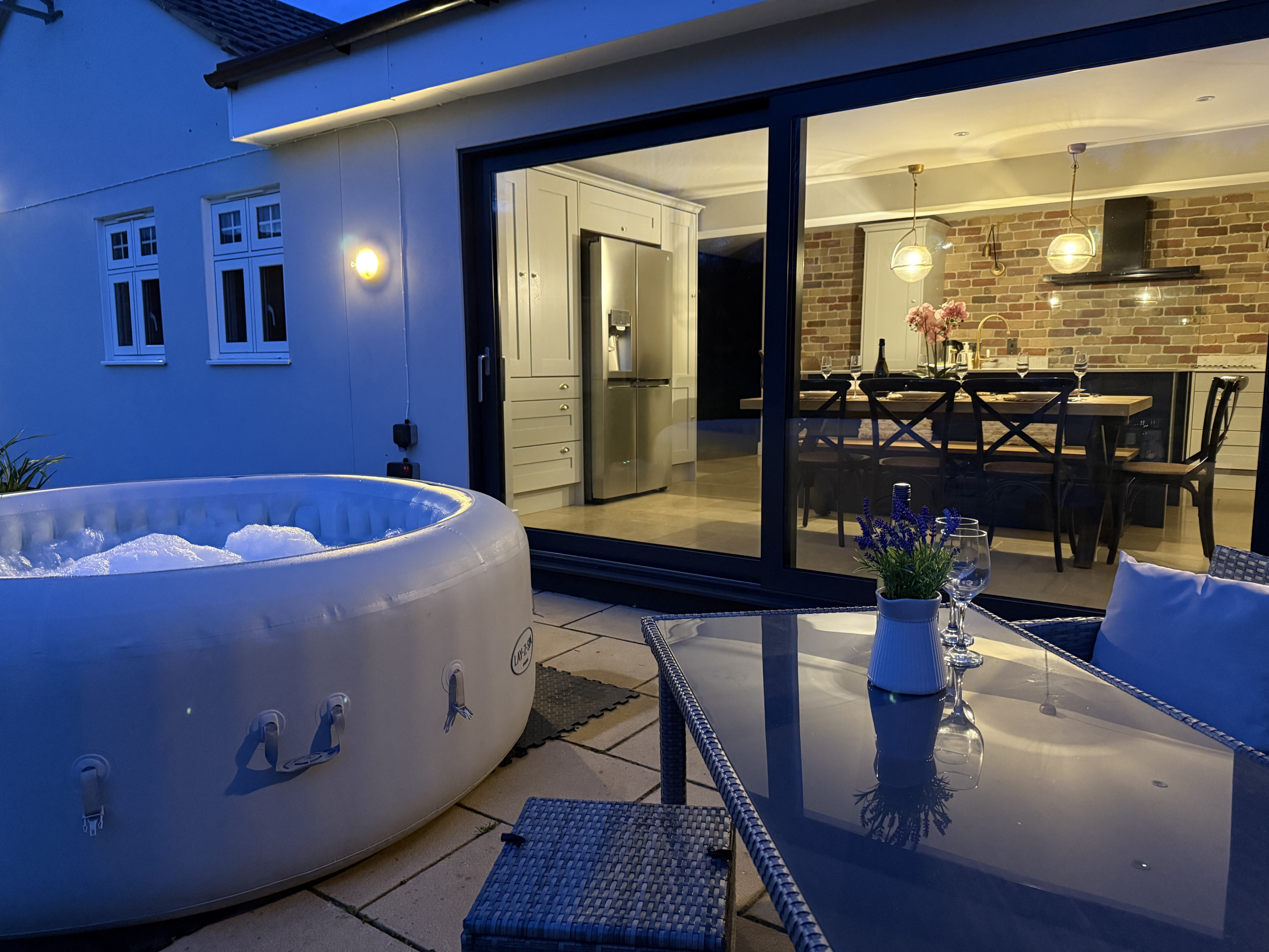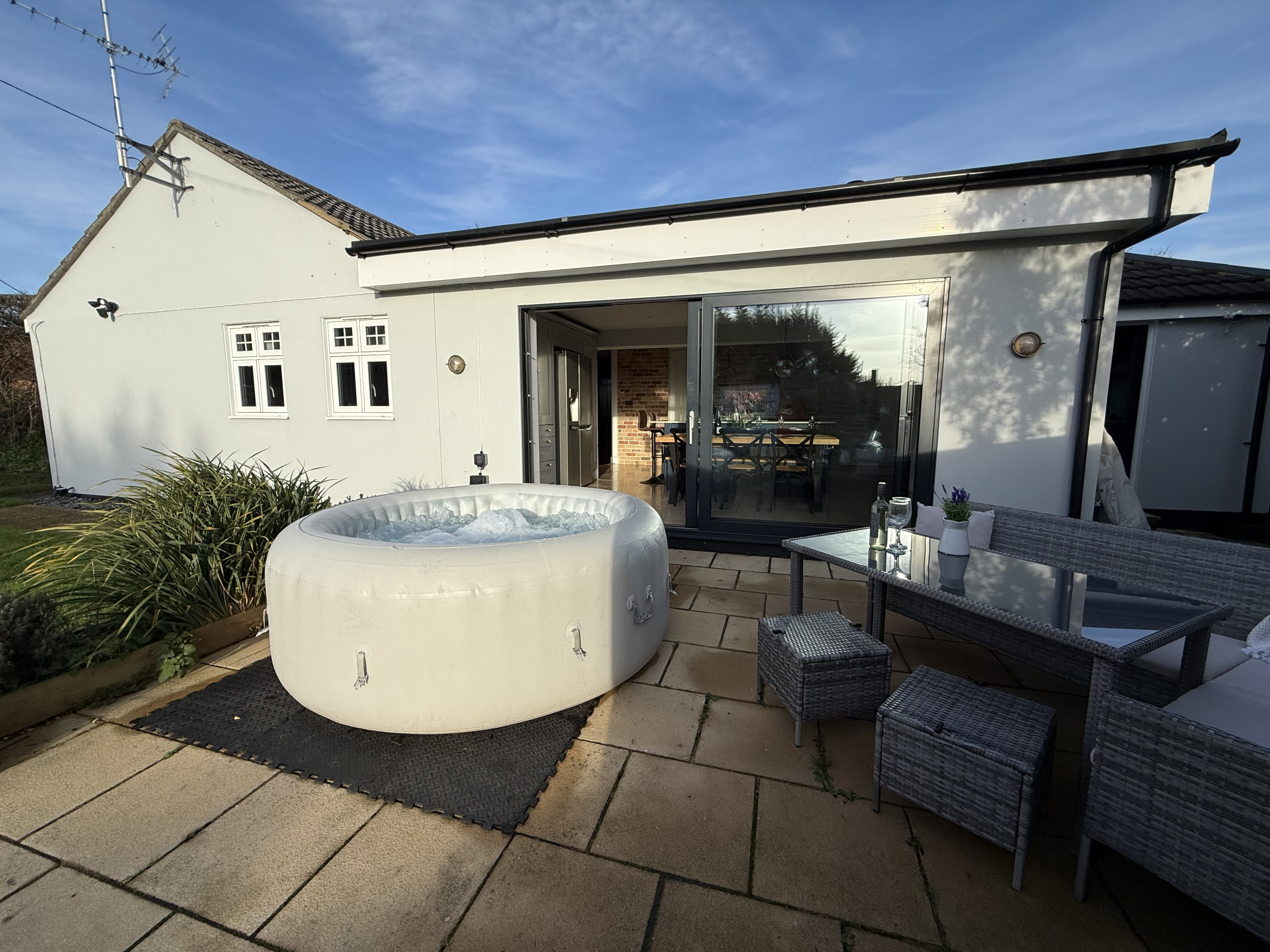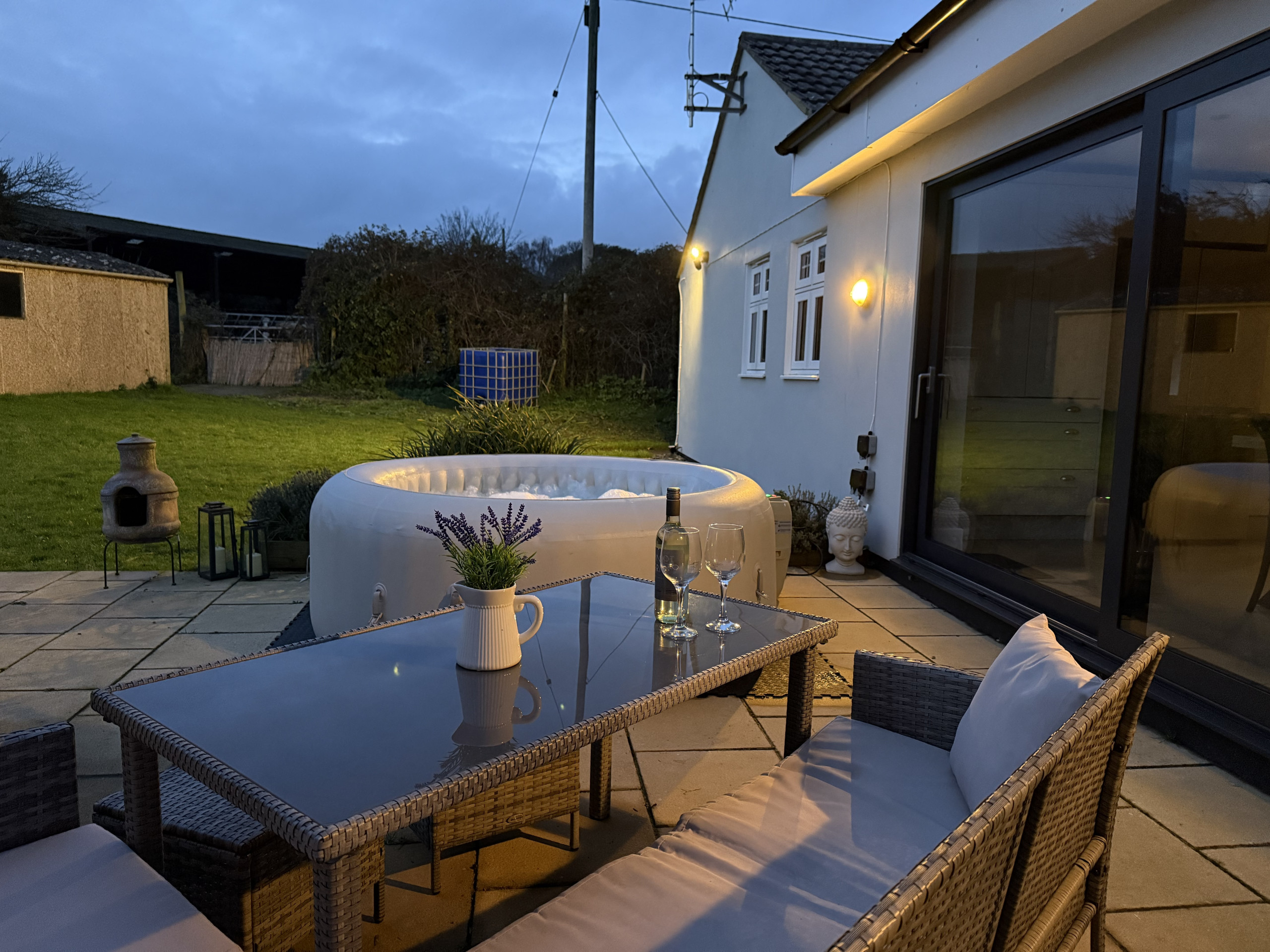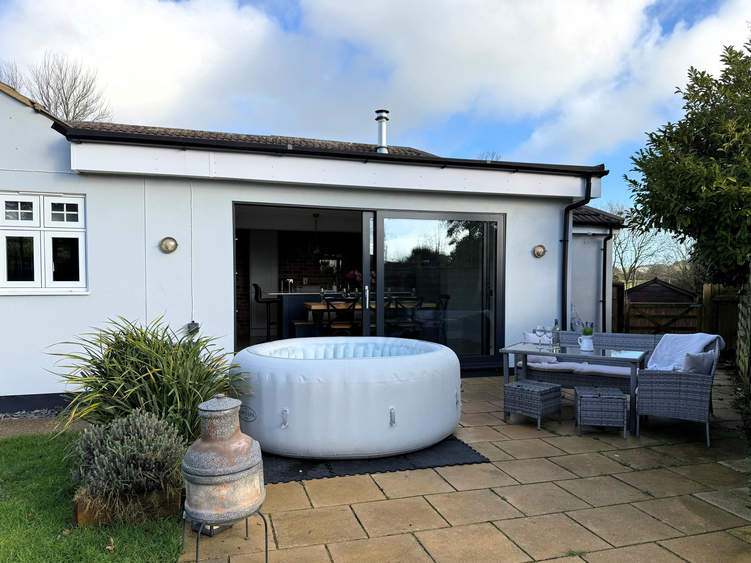 Whether you’re enjoying a morning coffee with countryside views or an evening soak beneath the stars, the outdoor space is a standout feature of Adgestone Villa.